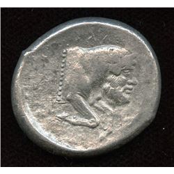 (25mm, 17.24g) Charioteer driving quadriga r., Nike flying right above, palmette with tendrils in exergue. Rev: Forepart of man-headed bull r. Sear-79