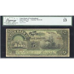 1179 - Union Bank of Newfoundland $5, 1889Geoffrey Bell Auctions