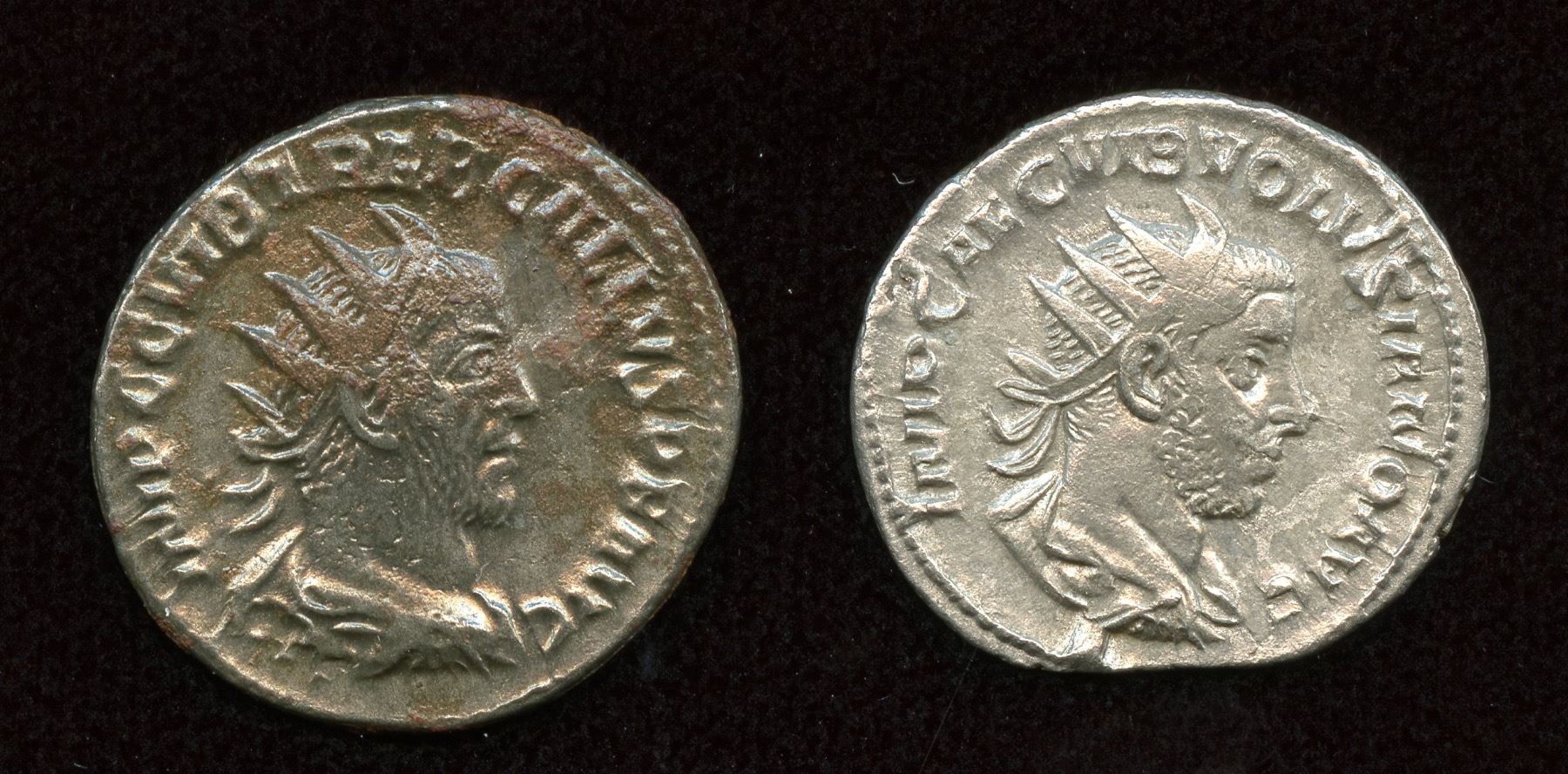 Gallus (4.34g) Billon Antoninianus, Rev: Juno std. l., holding corn-ears and sceptre. RIC 54; aEF, some deposits on both sides || Volusian (3.11g) AR Antoninianus, Rev: Volusian stg. l., holding branch and short sceptre. RIC 140; VF, light porosity on rev. 2 Pcs.