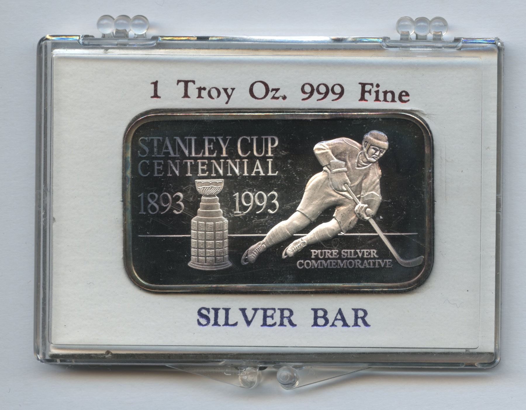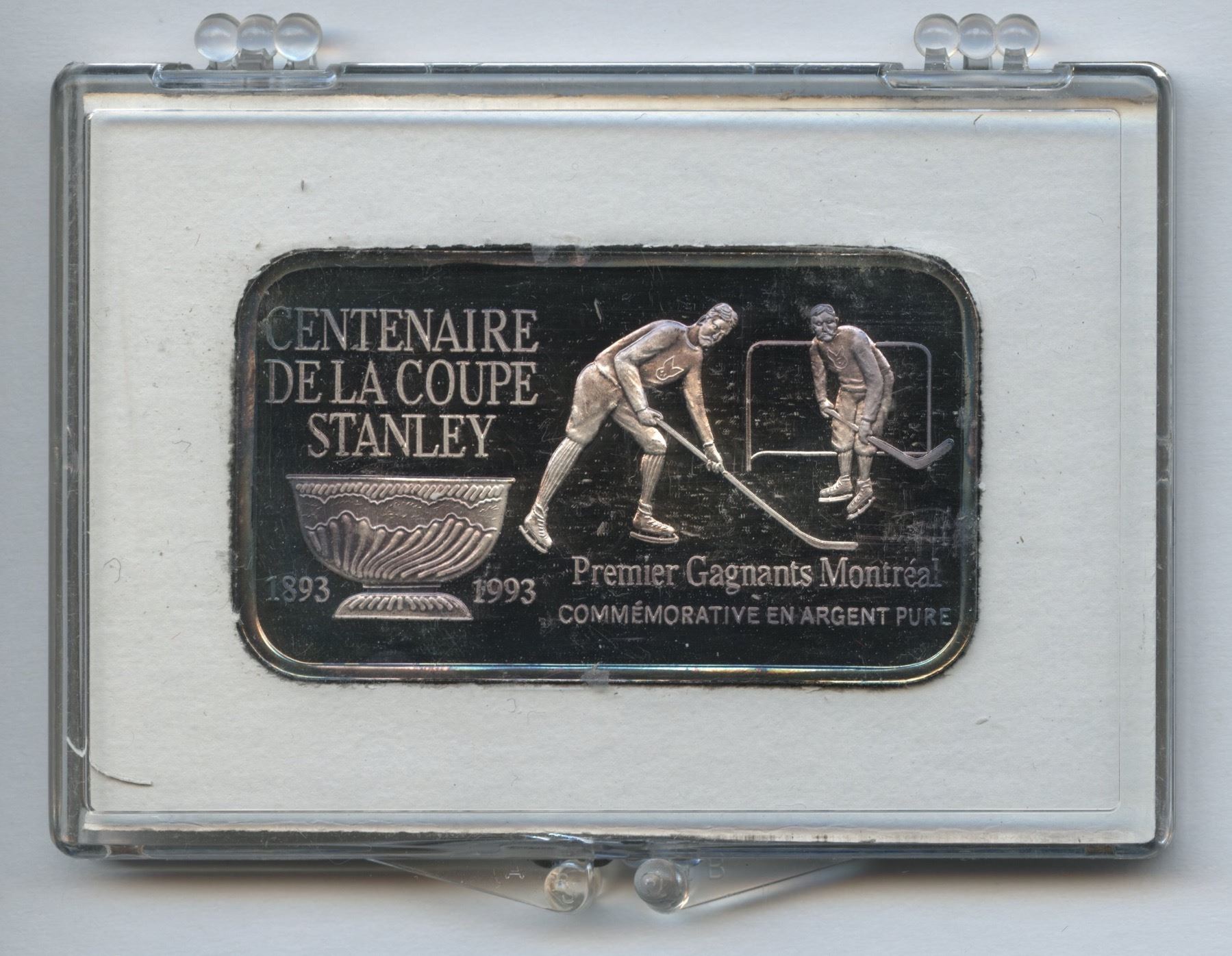 1 oz fine silver, Stanley Cup Centennial 1893 - 1993 Pure Silver Commemorative; Centenaire De La Coupe Stanley 1893 - 1993 Premier Gagnants Montreal, Commemorative En Argent Pure. In display case.