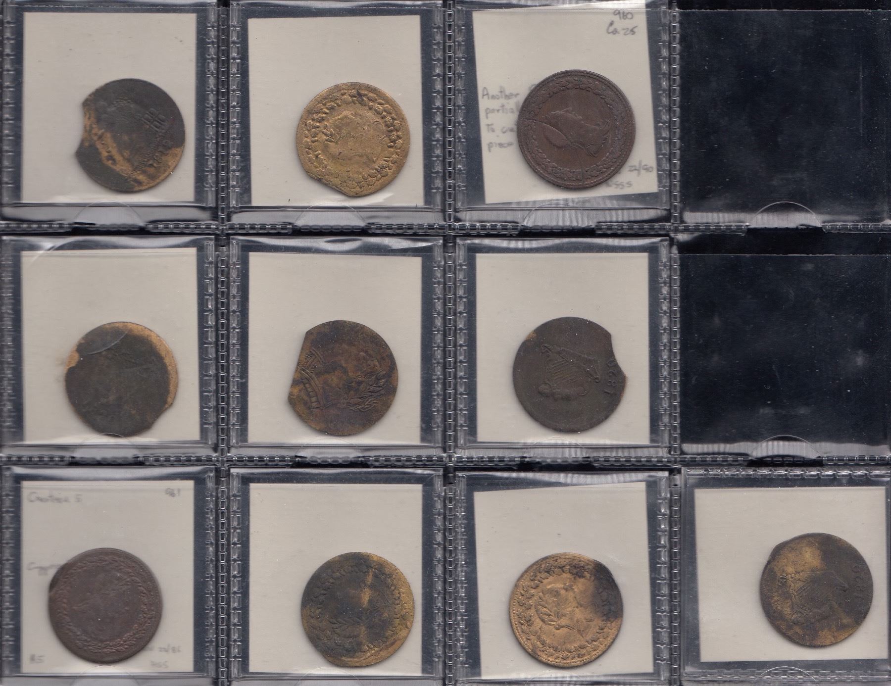 Br 960, 1012. A mix of planchet cutting errors and partial double strike at the rim. Cutting errors (6): Co. 1T x2 both 15% clip; Co 25T planchet cutting marks, Fine; Co. 15BH slight clip; Co. 17 x2, one 20% straight-edge clip, the other 10% clip. 3% double strike at rim (4): Co. 5T, EF, appears copper; Co. 3T; Co. 7T; Co. 16BH. Unless noted, all "hoard as struck". 10 Pcs.