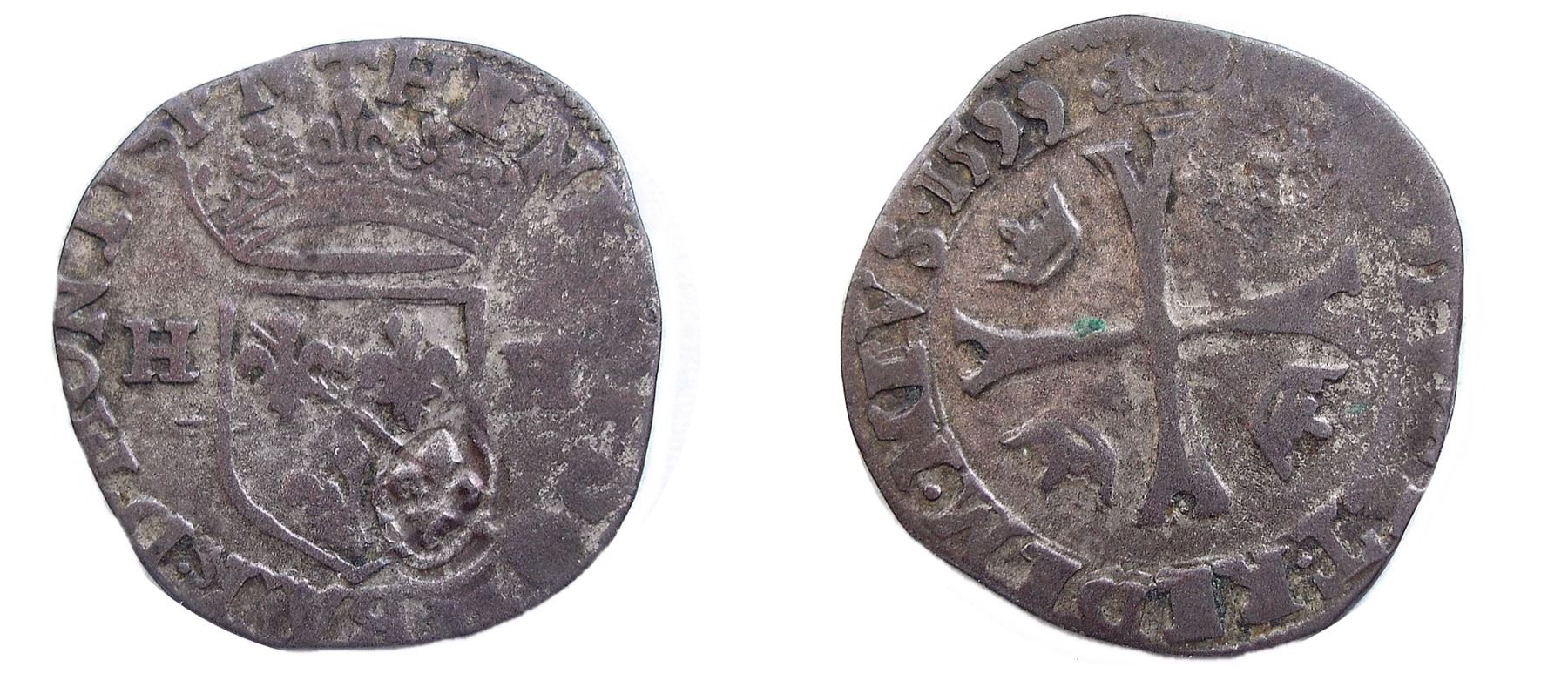 Host Coin of Dombes, Vlack Unlisted Type - 1640 countermark on 1599 [Trevoux Mint] Dombes Douzain of Henri II de Bourbon-Montpensier, Divo Dombes 103. Very Fine, a bit weakly struck at the right side of the obverse affecting the legend there and the corresponding part of the reverse, the rest of the lettering mostly sharp and the date especially strong. The design detail is sharp, easily of the VF level, and the countermark is applied to the obverse, but without flattening much of the reverse. Lightly clipped, but not too bad. Light antiqued pewter, the surfaces still retaining some of the original silvering. An impressive looking example. The majority of the (few) Dombes countermarks known are on coins of Henri II de Bourbon, though they are many times rarer than the countermarked regal French douzains of the same era. When seen, the condition is usually atrocious and the ones in this collection were chosen with an eye for quality, as well as for different dates and types.