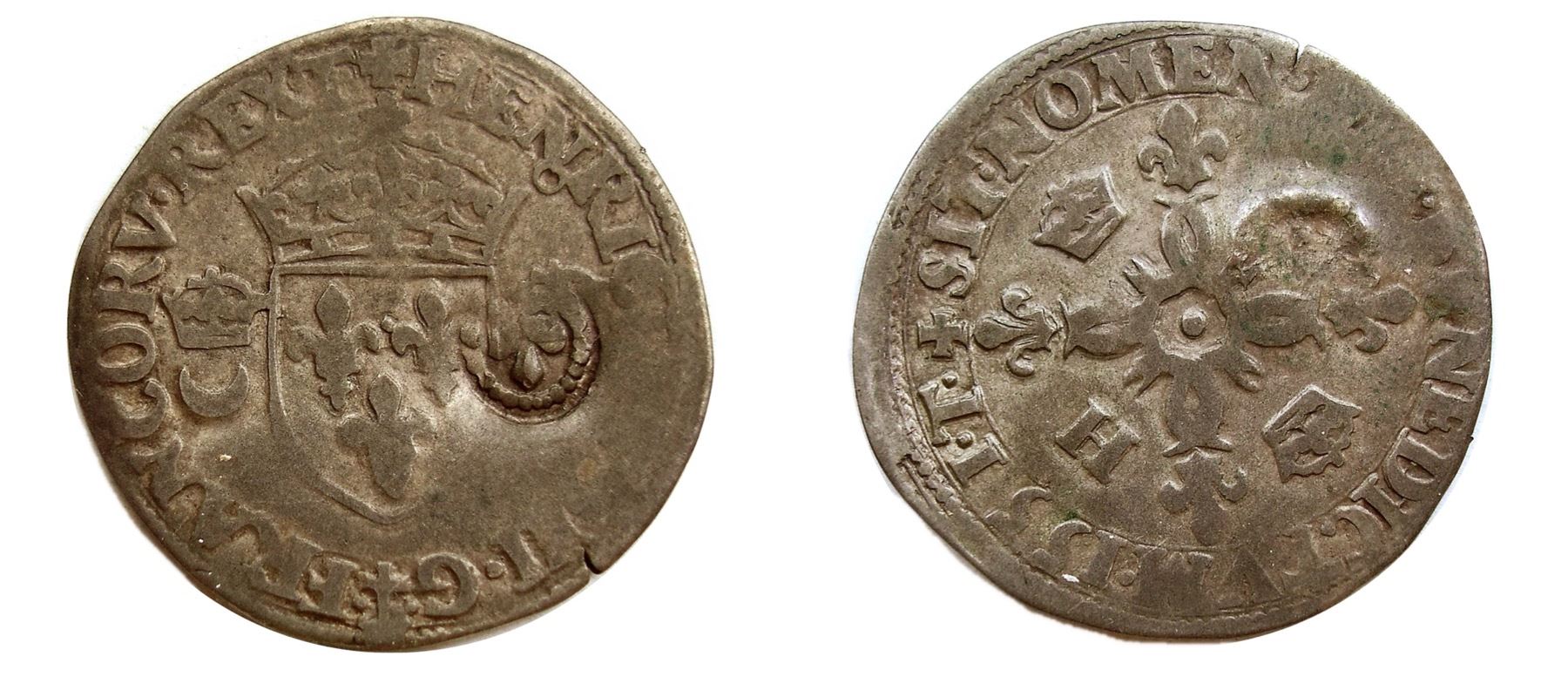 Host Coin of Henri II (ruled 1547-1559), Vlack 1g Type - 1640 countermark on a 1551-Cross on Globe [Mountelimar Mint] Henri II Douzain aux Croissants, Ciani 1305, Duplessy 997, Sombart 4380. Very Fine, a choice, well-struck and pleasing example of this distinct variety within the overall type – where the other mints placed their mark directly below the shield, Mountelimar placed theirs in the legend at the base of the obverse. Sharp and pleasing, the legends are full and mostly strong save for the area right at the obverse countermark and corresponding portion of the reverse. Light silvery grey, the surfaces are hard and pleasing, with few marks from circulation. A rare date/mint combination, the Mountelimar mint had one of the lowest outputs for the mints that produced this coinage in 1551. Quite pleasing, especially with the bold date and unusual mintmark.