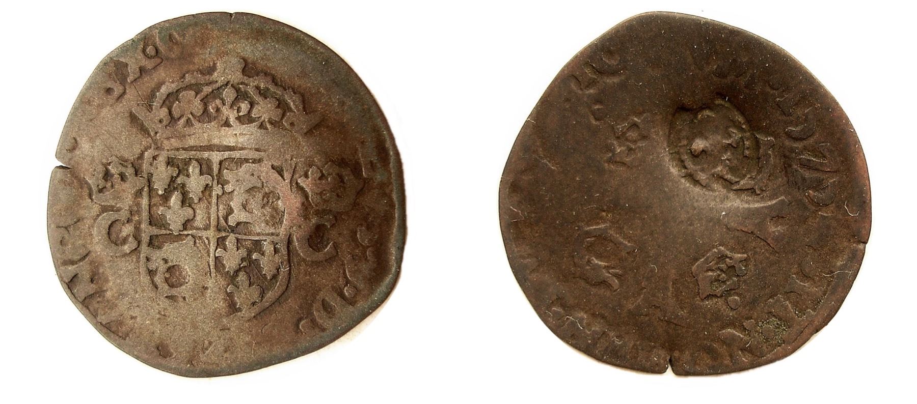 Host Coin of Charles IX (ruled 1560-1574), Vlack 1h Type - 1640 countermark on a 1575-Z [Grenoble Mint] Charles IX Douzain du Dauphine aux deux C Couronnes. Ciani 1387, Duplessy 1090, Sombart 4396. Fine, some areas slightly better. About half the obverse legend visible, including the mintmark at the base of the shield, while most of the reverse legend is strong, including the date. The countermark is on the reverse, but with very little flattening on the opposite side. This date was not listed in Duplessy, though Sombart notes it. A very scarce type as a host coin, this issue was struck only at this mint, and just for three years, 1573-1575, and only the first year had a mintage of over 50,000 coins. This is the only Dauphine douzain issue for Charles IX, and it must be considered quite rare as a host for a 1640 countermark.
