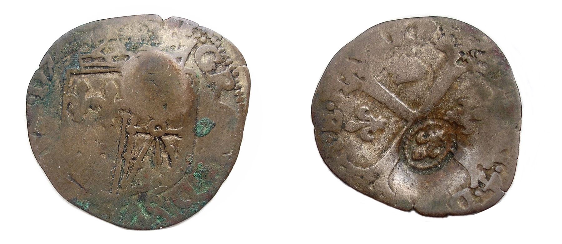 Host Coin of Henri IV (ruled 1590-1610), Vlack 1k Type - 1640 countermark on a 1592 [Saint-Palais Mint] Henri IV Douzain de Navarre, 2nd type, Ciani 1566, Duplessy 1260, Sombart 4452. Fine/Very Fine or so, the planchet heavily clipped, affecting the tops of the legends on either side, though the date is fairly sharp on the obverse. Medium gray, the obverse with some raised green spots that can likely be removed, the countermark applied to the reverse, thankfully not obscuring the distinct shield which helps to immediately identify the type. This type was struck only at this mint only from 1590-4; this date has no reported mintage, but is rare enough that Sombart was able to locate just 5 specimens, meaning that it must be quite rare with a 1640 countermark.