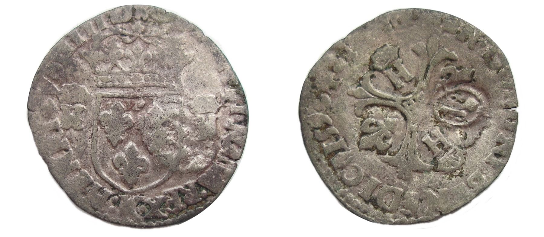 Host Coin of Henri IV (ruled 1590-1610), Vlack 1k Type - 1640 countermark on a 1593-K [Bordeaux Mint] Henri IV Douzain aux Deux H Couronnes, 1st type, Ciani 1560, Duplessy 1253, Sombart 4432. Nearly Very Fine, the legends mostly sharp, including the mintmark, the date a bit weak at the last digit though it is clearly a 3 (this type was struck only from 1590-4); the countermark on the reverse. Nice lighter silver color, a few marks from circulation but none distracting. A distinct type in the series, the somewhat plain cross found on the reverse of the earlier issues is now much more elegant, with three fronds at each arm and a diamond shaped center. Bordeaux struck the type in 1591-3 only, and never with more than 100,000 pieces. This is the most available date and mint for the type, and Sombart was able to locate all of 9 specimens; far fewer likely exist with the 1640 countermark.
