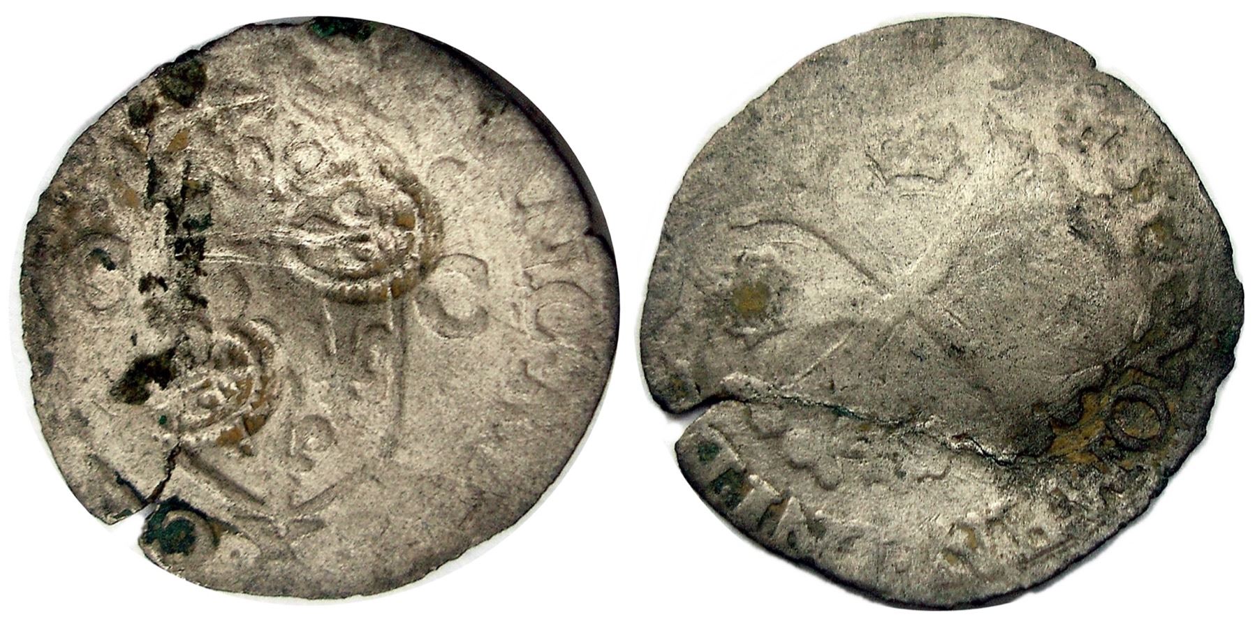 Host Coin of Charles X (proclaimed King 1589-1590), Vlack 1j Type - 1640 countermark on a 1593-X [Amiens Mint] Charles X Douzain aux Deux C, 1st type, Ciani 1491, Duplessy 1180a, Sombart 4412, another. Fine or slightly better, weakened more by a large planchet crack that was there before the piece was struck than by actual wear. About half the legend visible on either side, including the last digit of the date and the X mintmark at the base of the obverse – since this type was struck only from 1590-5 the final digit is all that is needed. An extremely rare subtype within the 1640 countermark series, this one featuring TWO countermarks, both on the obverse, and both quite strong. Only a handful of specimens for the entire 1640 issue are known with multiple countermarks, and this one is likely unique on this host coin type.