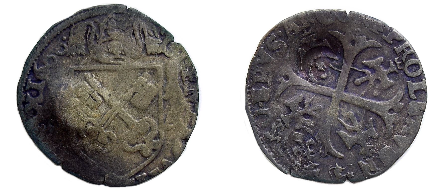 Host Coin of Clement VIII, Struck at Avignon, Vlack 1m Type - 1640 countermark on a 1600 [Avignon Mint] Papal Douzain of Clement VIII, Berman 1518, no letters in obverse shield, Jerusalem cross and lions on reverse, date moved to the obverse. Nearly Very Fine, somewhat erratically struck, but on a larger planchet which has some light edge splits. This allows more of the legend to be visible on either side than usual, including the last two digits of the date, which was moved to the obverse for this design type. The central details are especially sharp, despite the countermark being applied twice on the reverse, the first time very faintly then moved slightly to one side and struck again with more force. Gunmetal gray, the silver ratio higher than that found on the more coppery appearing specimens. Quite pleasing for this turn of the century year – which was proclaimed a jubilee and saw some 3 million pilgrims visiting holy places.