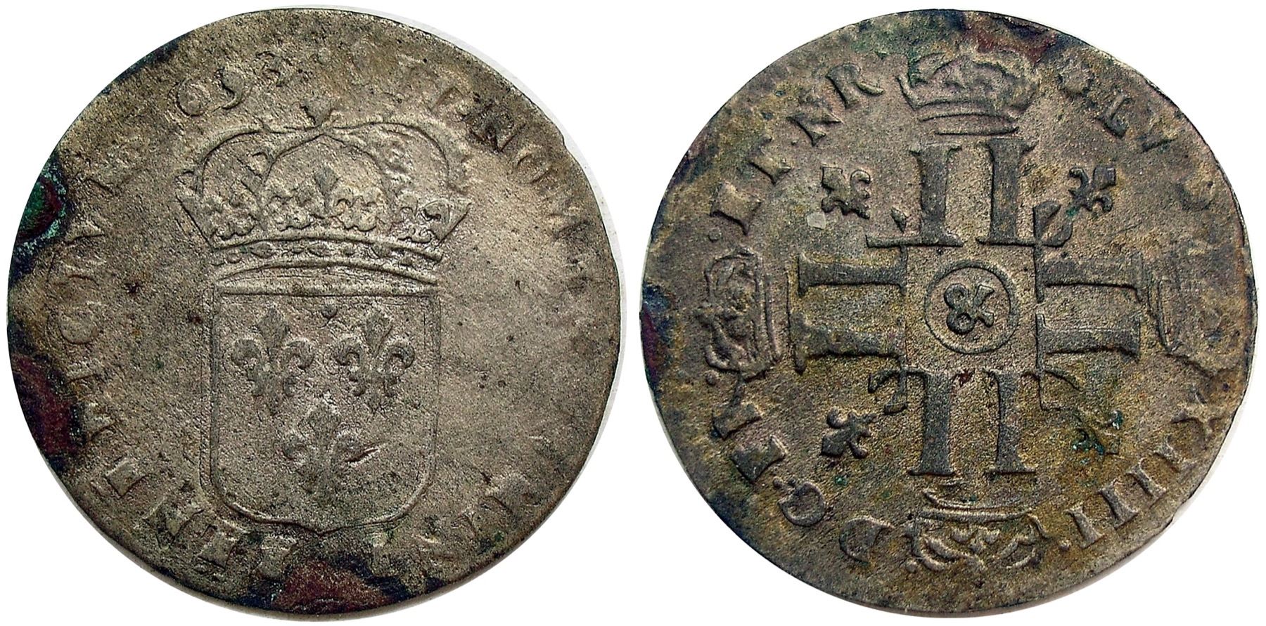 1693-“&” [Aix Mint] Sol de 15 Deniers, Gadoury 91. Very Fine or better in terms of wear, struck on a virgin planchet, the obverse showing clear double striking, which has also caused some weakness at the extreme right of this side; other than those few letters the legends are full, the ones on the reverse especially strong, the date and mintmark all there, and with nice design details. Medium gray with some mottled colors and a few splotches around the peripheries. Gadoury reports the mintage on both earlier douzains and virgin planchet stock.