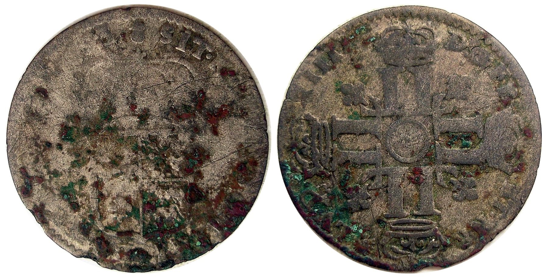 1693-“Dot in Circle” [Pau Mint] Sol de 15 Deniers de France-Navarre-Bearn, Gadoury 94. Very Good or so, struck on a virgin planchet. The grade is almost irrelevant on this extremely rare type, given a separate number in Gadoury and all the other earlier references because the Pau Mint design was different from the other mints. The others have a shield on the obverse with three large fleur-de-lys, while the Pau mint pieces have the shield divided into three parts, the left half has three smaller fleur-de-lys, the upper right half with a shield and the lower right half with a pair of cows (which later became the mintmark of the Pau mint). These are easily recognizable even in low grades – which is a good thing, because their grade is almost invariably low. This type was struck 1692-1700, but Gadoury gives no mintage figures for the first three years, and save for a single year that had a 133,701 struck, the mintages were exceedingly low – the final year with all of 692 examples coined! The Pau mint is invariably one of the rarities in any of the French Colonies series, and is legendary among specialists; while its location very close to the Spanish border put it well away from the other French mints, the area was not by any means a backwater – King Henri IV was born there, and it is known for wonderful views of the Pyrenees. This type was priced higher in earlier versions of Gadoury than in the current one, and we disagree with the assessment in the new version. This has always been an extremely rare issue, one that is almost never offered for sale. It is also an issue that the collector cannot afford to be too picky on in terms of grade. If one is offered, buy it – it will likely be many years before another is found!