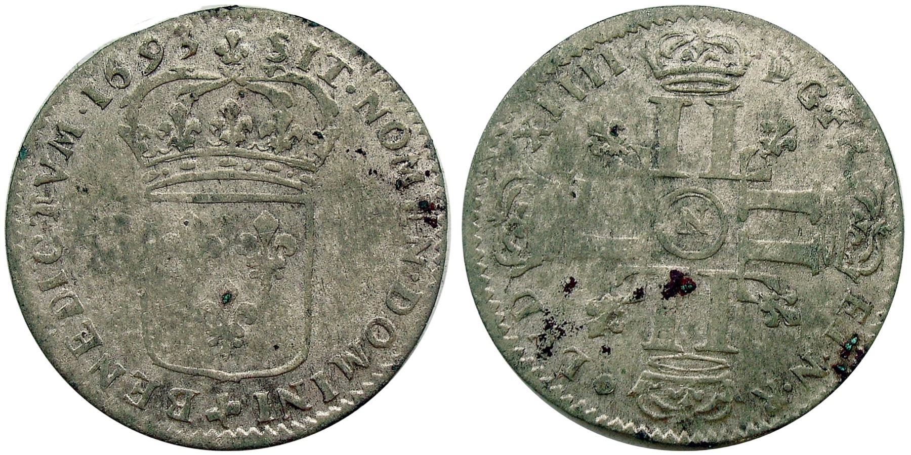 1693-N [Montpellier Mint] Sol de 15 Deniers, Gadoury 91. About Uncirculated, a coin that likely saw much active use as currency but which is somewhat weakly struck at the centers accounting for the grade here. The legends, however, are full and strong, as is the date and mintmark. Lovely light silver with a few specks of darker color on either side, the surfaces clean and natural. Gadoury lists this date and mint both recoined and on virgin planchet stock, with about 1/3 less struck on the virgin planchets. This is an UNLISTED legend error, the reverse legend ETNR here mistakenly spelled out as ET * N * R with two large stops breaking up the word unlike anything else in the series. Presumably quite rare, a search through available photos showed no duplicate with this legend error, and it was likely noticed early on, with the offending die either corrected or taken out of service.