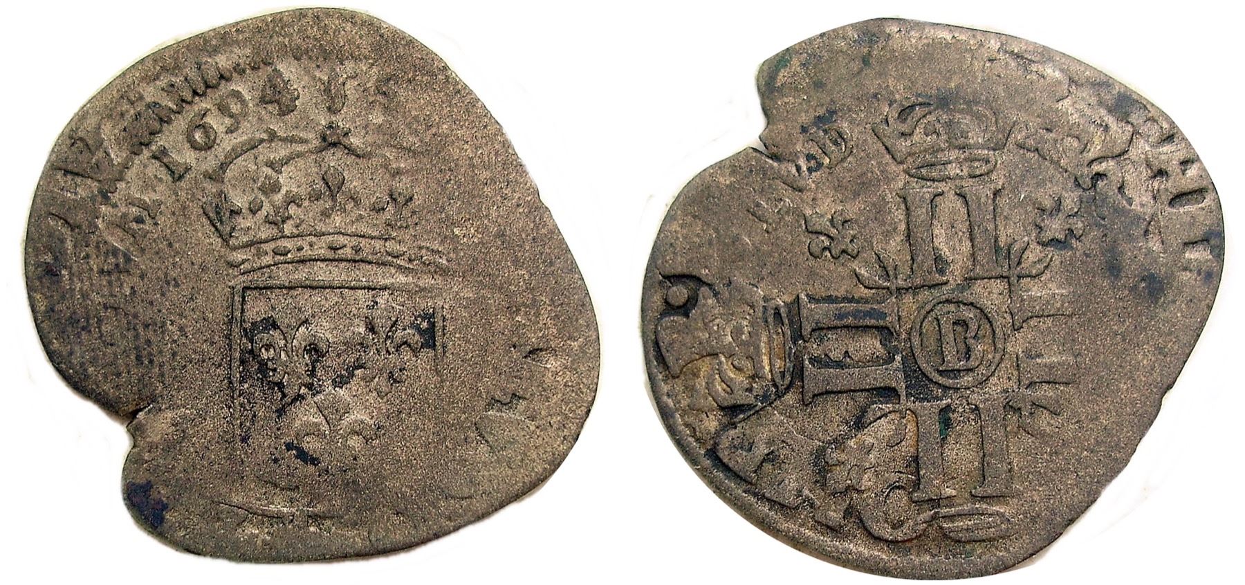 1694/3-B [Rouen Mint] Recoined Sol de 15 Deniers, Gadoury 91. Very Fine, overstruck on an earlier douzain without a countermark, the host coin wonderfully misshapen, making for an eye-catching example. Amazingly, even though most of the peripheral legends are weak or non-existent due to the odd shaped planchet and the overstrike, the date itself is bold, and it clearly shows the final digit over a 3, an unlisted overdate in Gadoury (though many of the French issues are known with overdates, this is especially true for the later Sous Marques series). Even better, this is a COMPLETELY UNLISTED date and mintmark combination in Gadoury for any of his three planchet types – though years before and after are known from this mint, so its existence is not unexpected. Though the peripheries appear to belong to a lower grade coin, the true condition is shown by the strong central devices, including a bold mintmark. An extremely rare specimen, not only an unlisted date but an unlisted overdate too!