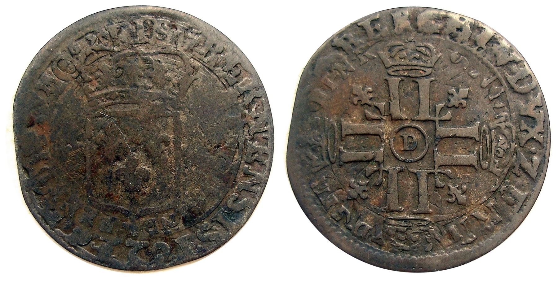 1694-D [Lyon Mint] Recoined Sol de 15 Deniers, Gadoury 91. Very Fine, overstruck on an earlier, large coin – but NOT over a French douzain! This example is overstruck on a 1622 Batzen from the Swiss canton of Bern, the undertype attributed as Krause-Mishler 15. An amazing coin, the host coin larger than the dies for the French sol, with much of the legends still visible, including the date. The legend of the host coin reads MONENOREIPV BERNENSIS 1622 (New coin from the city of Bern) and the reverse reads +BERCHT·DVX·ZERIN·FVNDATOR (Berthold, Duke of Zähringen, founder). While the obverse features a shield that is at least similar at first glance to the French issues, the reverse has a double-headed eagle that would be immediately recognizable as something definitely not French; traces of this eagle can be seen in the reverse fields. While some of the earlier 1640 countermarks were done on pieces not produced in France (including papal douzains and Spanish Netherlands patards), the vast majority Recoined Sols thus far have been only found struck over earlier French coins or on virgin planchet stock. Tellingly, while the Batzen was struck early enough to have been a host coin for the 1640 countermarks, none were used as such. The present example is extremely rare as an overstrike on a Swiss coin, and is one of only a handful of Recoined Sols known overstruck on anything other than an earlier French douzain – but check out the 1694-H and 1696-A examples offered below for a different foreign coin undertype, and another over a different Swiss canton issue. Highly important, and really irreplaceable!