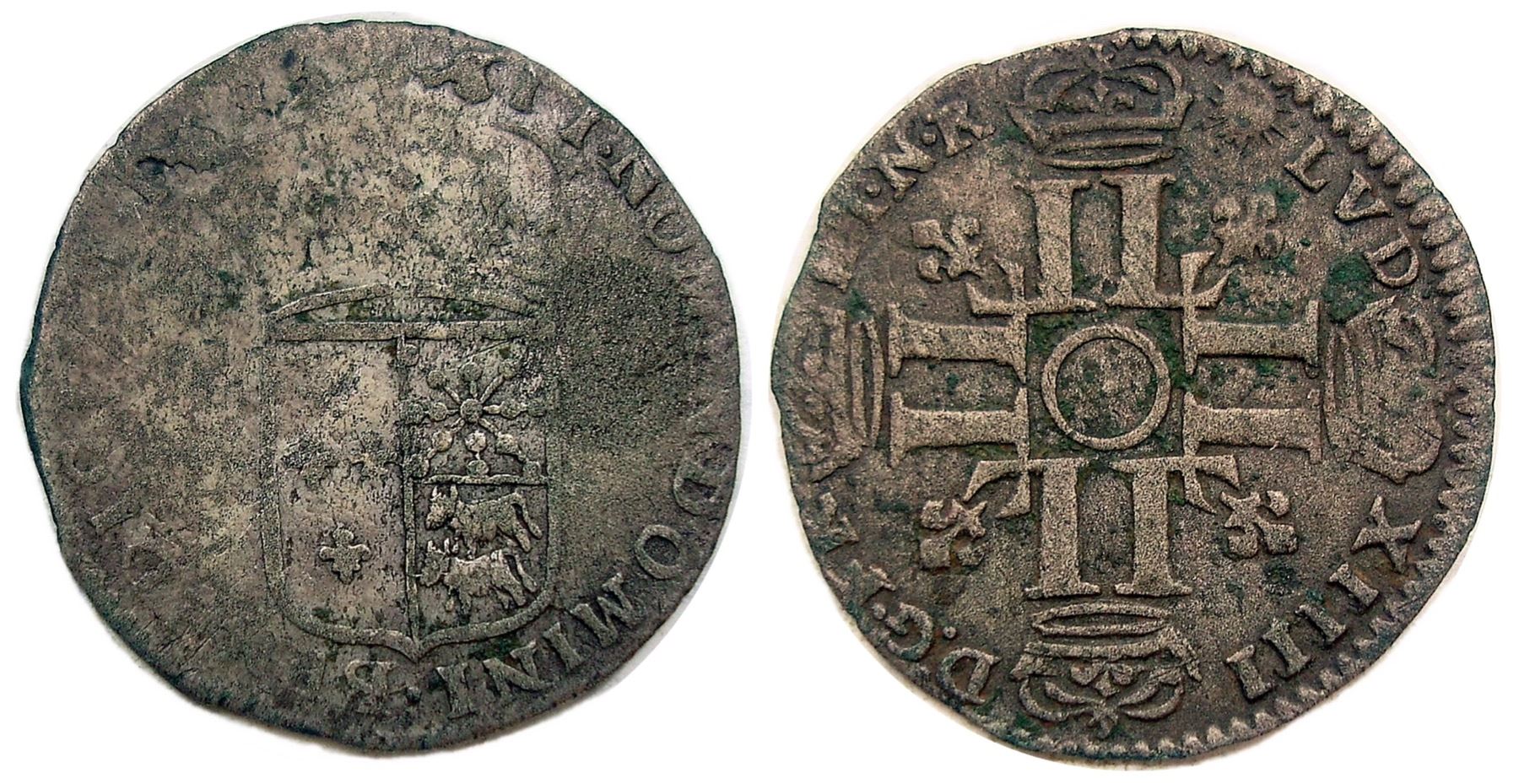 1695-“Dot in Circle” [Pau Mint] Sol de 15 Deniers de France-Navarre-Bearn, Gadoury 94. Very Fine or nearly there, about the finest one could ever hope to find for a Pau mint issue! Struck on a virgin planchet, though one that is not perfectly round, which is typical for a mint that had such poor quality control; there are no traces of an undertype visible, even in the weakly struck area, so we are confident this is on a virgin planchet. Weak at the left side of the obverse, though much of the legend there can be made out, the letters just fainter than the rest, as is the case for the date. The rest of the legend on this side is strong, the distinct shield is as sharp as any we have seen – Pau mint issues simply do not come nice, and Gadoury needed to use a drawing to illustrate this number in his book, instead of using an actual coin! The reverse is more evenly struck, the legend full, the individual letters all strong, and the curious “dot in a circle” mintmark bold at the center. Medium gray, the surfaces lightly rough and with a dark circular toning spot on the obverse and some light green flecks on the reverse. Better than nearly all of the few Pau mint issues of this type we have ever seen – if one holds out for a truly nice Pau issue for this type, one will likely spend a lifetime waiting! Gadoury lists the mintage as a paltry 24,500 coins, but lists them all as recoined pieces, and the date is UNLISTED on a flan neuf as here. An exceptional opportunity for the advanced collector.
