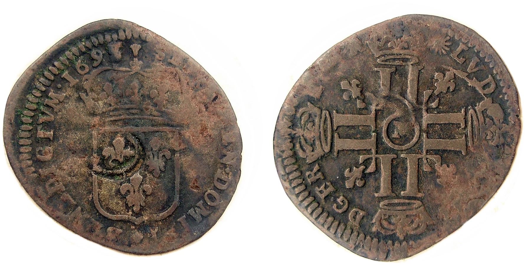 1695-M [Toulouse Mint] Recoined Sol de 15 Deniers, Gadoury 93. Very Fine, overstruck on an earlier douzain with the 1640 countermark, here visible on the obverse. The host coin was clipped on opposite sides, making the piece somewhat oblong in appearance, affecting some of the legends on either side, weakening those at the upper left obverse and the ones at the lower right reverse off the planchet. Otherwise well struck, the rest of the legends visible including the date and mintmark, and the design detail sharp for the grade. A late state of the reverse die, with a notable break under LVD, and a possible overdate, the obverse appearing to have the 5 over a 4, though it isn’t sharp enough to be certain. Attractive rose and pewter color. This date is UNLISTED in Gadoury as being overstruck on a planchet with a 1640 countermark; earlier editions had no pieces from 1695 from any mint on this type, while the new edition only lists 3 mints striking coins over douzains with a 1640 countermark. This date and mint is also unlisted as overstruck on regular douzains, his reported mintage under Gadoury 91 being on virgin planchet stock.