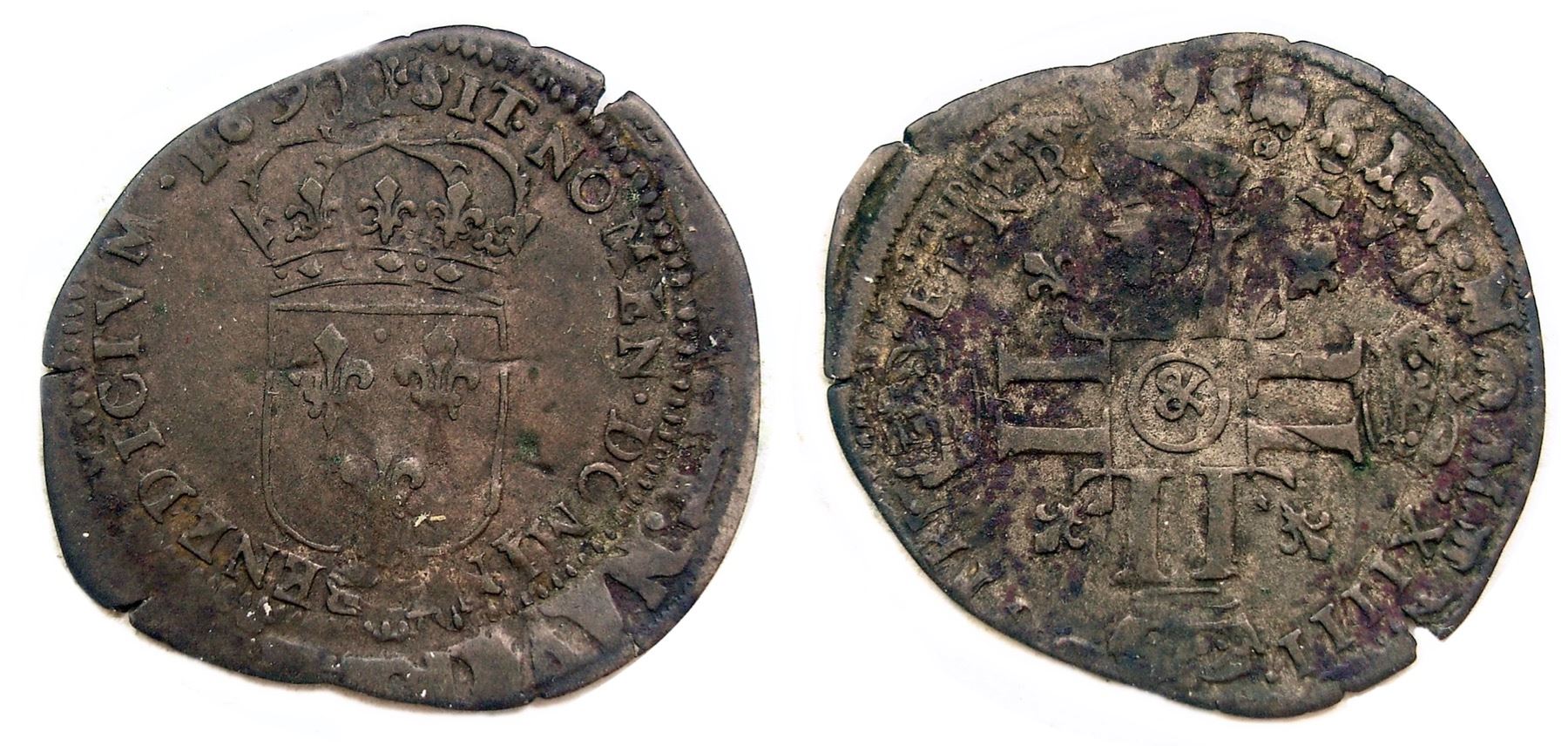 1696-“&” [Aix Mint] Recoined Sol de 15 Deniers, Gadoury 91. Choice Very Fine, boldly overstruck on an earlier douzain which has a 1592 date prominently visible at the top reverse – double dates, over a century apart! Well struck, the legend of the Sol full and mostly bold, the final digit of the date weak but visible, the mintmark strong and with bold design detail. The host planchet is large enough that roughly 1/3 of its legends are visible on the obverse periphery and closer to half on the reverse, a very eye-catching overstrike. Medium gray, nice hard surfaces, the reverse with some unusual purple stains, likely removable. UNLISTED in Gadoury as coming overstruck on anything, the reported mintage figure for this year is all on virgin planchets.