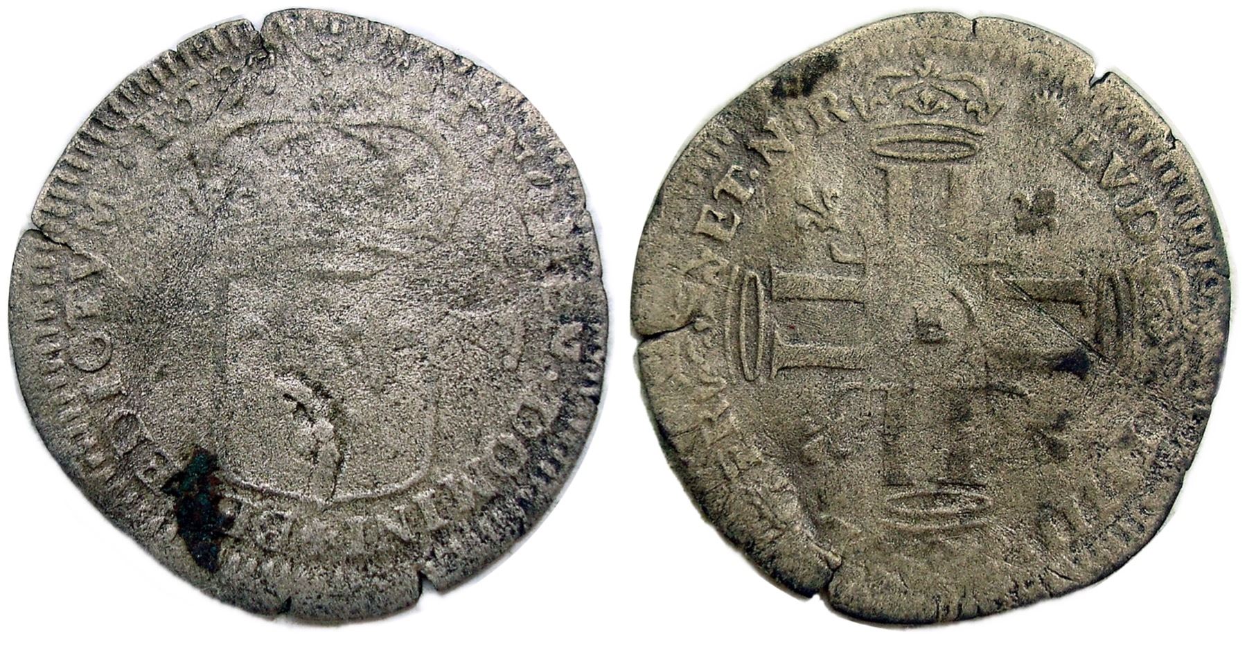 1697-E [Tours Mint] Recoined Sol de 15 Deniers, Gadoury 93. Fine or so, overstruck on an earlier douzain with the 1640 countermark, here weakly visible on the obverse side at the base of the shield. Full legends on either side, a few letters weak but all visible. Light silvery color, either side with a small stain, the surfaces with a light roughness to them that looks like what one sees on silver coins recovered from treasure ships. A few tiny edge splits.