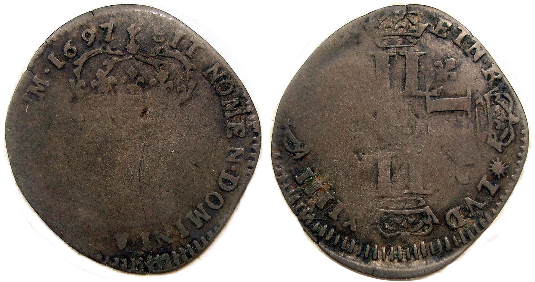 1697-H [La Rochelle Mint] Recoined Sol de 15 Deniers, Gadoury 91. Very Fine, overstruck on an earlier douzain, without the 1640 countermark. The host coin was clipped, giving a diamond-shaped look to the Sol. Weak at the extreme left obverse and upper left reverse, the rest of the legends sharp on either side. The date is bold, the mintmark a bit weaker but all visible and clearly an H – the mintmark verified by the acorn different on the obverse which is sharp, and was first used at this mint in this exact year (though records do not exist identifying the engraver it signifies). This is important because this is an UNLISTED date and mintmark in Gadoury, for being overstruck on a later douzain, though he does list it struck over the earlier, larger douzains (his type 92, but without any mintage figures. Quite rare, and a charming specimen.