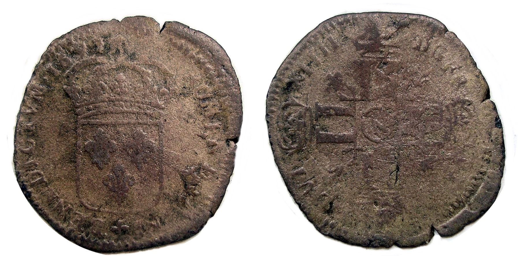 1697-N [Montpellier Mint] Recoined Sol de 15 Deniers, Gadoury 91. Fine, overstruck on an earlier douzain, without the 1640 countermark. Fine or so, most of the legends are visible on either side though letters are occasionally a bit weak; the date and mintmark are both weaker but all there and the design detail is as expected for the grade. Light gray, the surfaces with a light but even roughness, the planchet nicely misshapen from the overstrike and with a few light edge splits as a result. Montpellier struck this year on both virgin planchets and over earlier douzains – after a half decade of most mints overstriking these earlier issues it is amazing that there were still examples left to be recoined, but that continued to 1700 for a couple mints at least! This example is from the Robert Vlack collection, and comes with his distinct typewritten envelope.