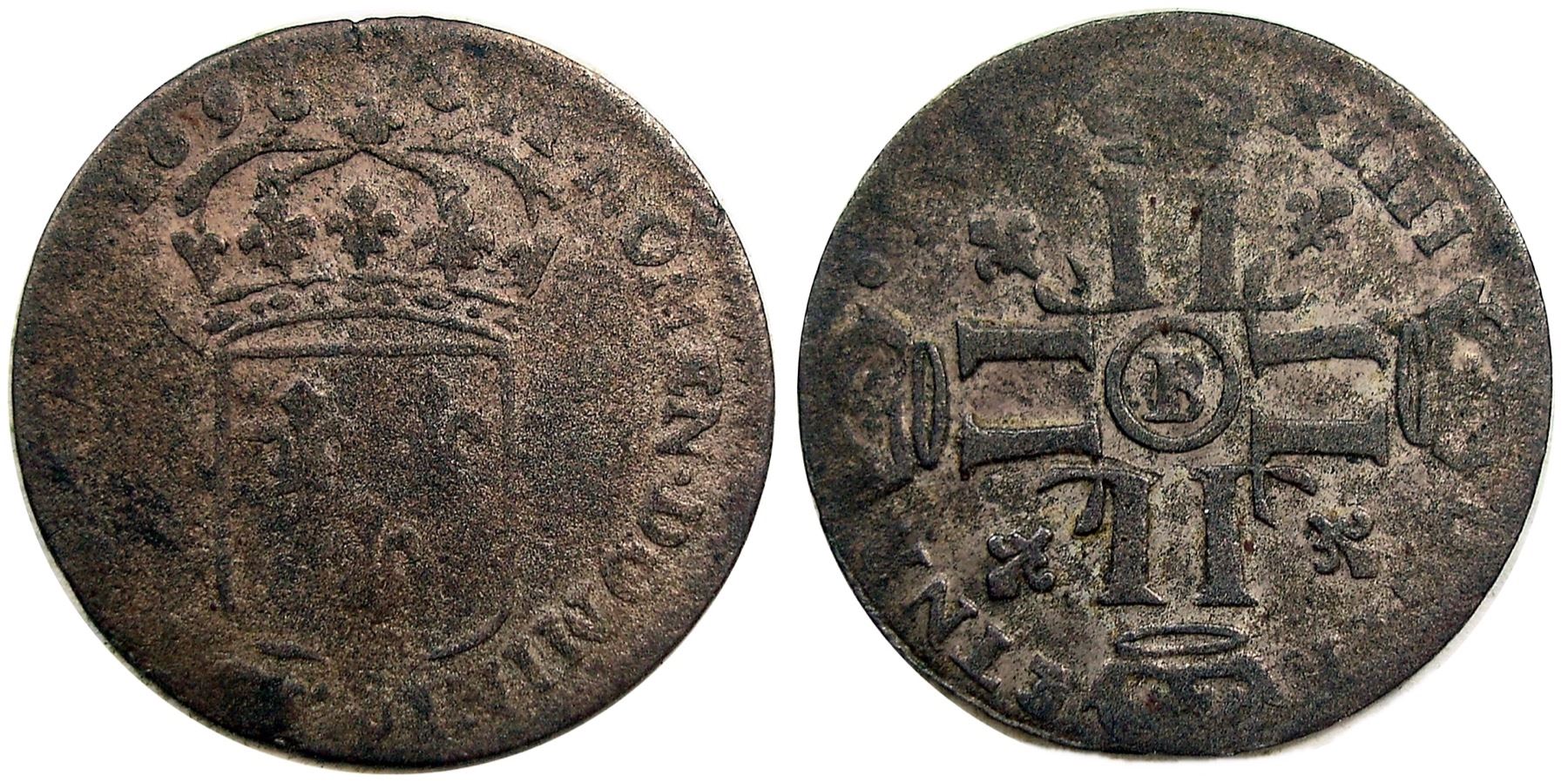 1698-B [Rouen Mint] Sol de 15 Deniers, Gadoury 91. Very Fine, struck on a virgin planchet, the only type listed in Gadoury for the issue. With the usual weak strike associated with the thin flan neuf stock, here weak at the left obverse and corresponding portion of the reverse, though only a few letters are lost on either side, and the date and mintmark are both strong. Nice deep pewter, the surfaces with the expected light roughness as almost always found on the virgin planchet pieces, even in high grade. While Gadoury only lists this date and mint on virgin planchets, it is rare enough that it is unpriced in any grade in his book.