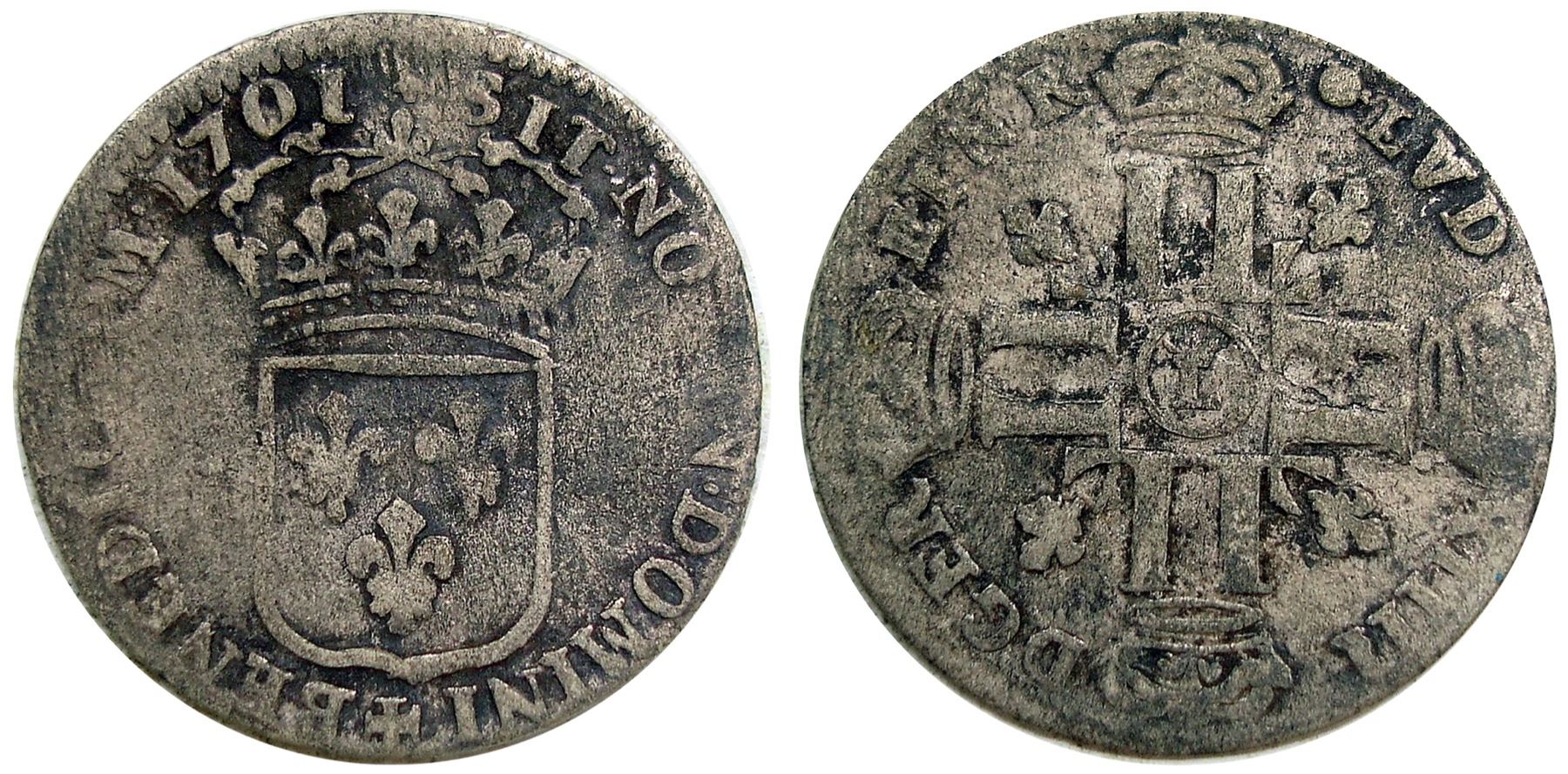 1701-Crowned L [Lille Mint] Sol de 15 Deniers, Gadoury 91. Very Fine or nearly there, struck on a virgin planchet. A few letters weak on the obverse, all there on the reverse, the date and mintmark both bold. Light pewter hue with some darker tone, the surfaces with the expected light roughness to them, but overall not bad. The date and mintmark are both sharp. Despite having half the mintage of the 1701-B (offered above), the Lille issue seems to have more pieces extant for the year – though not by much, and this late date issue can still be considered quite a rarity.