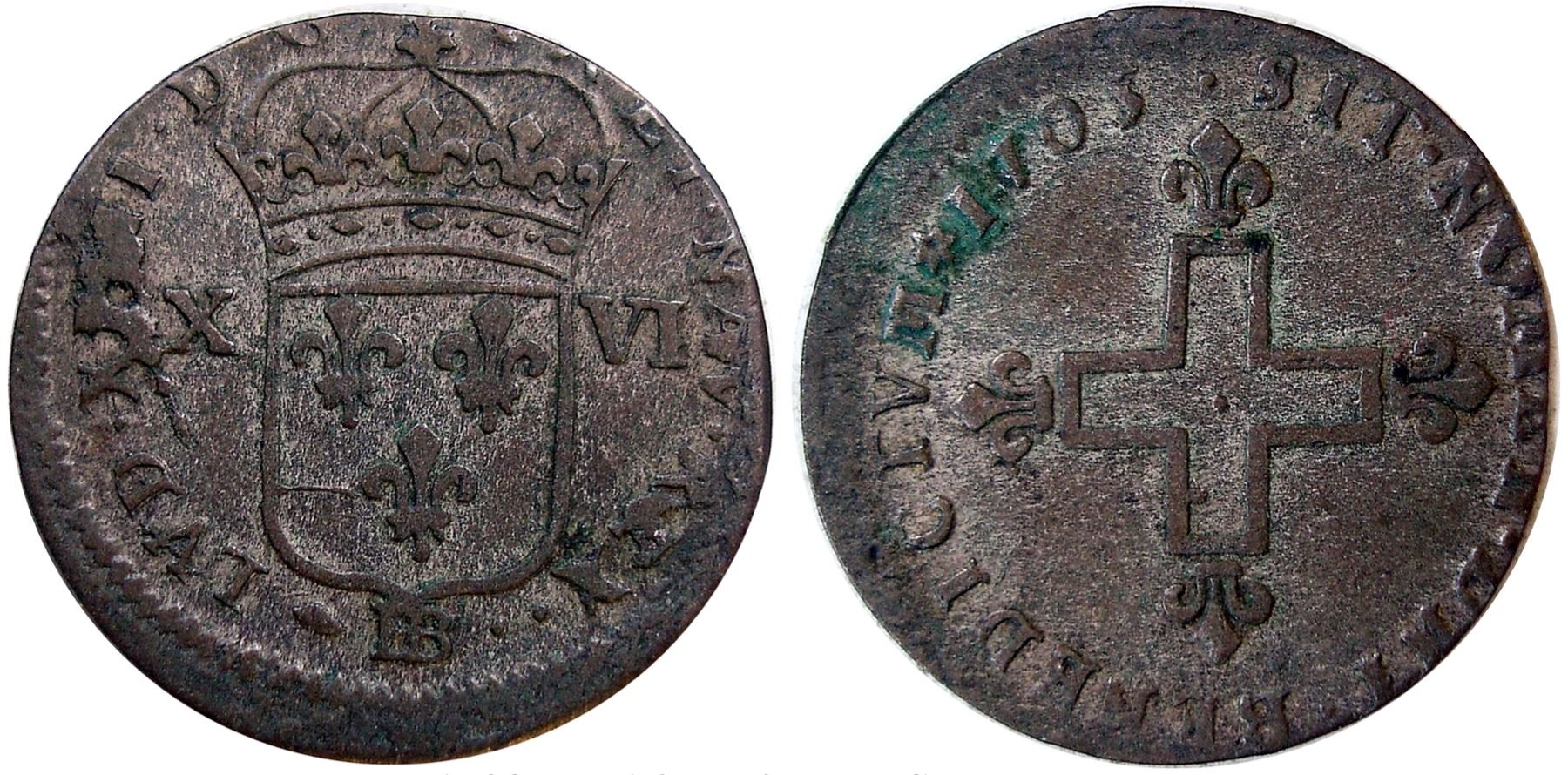 1703-BB Sol of 16 Deniers. Extremely Fine or so, struck slightly off-center, affecting just the tops of the letters at the upper obverse and corresponding area on the reverse. Medium pewter gray, the surfaces with a very light roughness, likely as struck; a small patch of green patina on the reverse can likely be removed. From a late obverse die state with a large area of die breaks at XIII and a smaller one connecting the bottom fleur-de-lys to the shield. This variety features the normal reverse style to this time of the rowel different before the date, and a dot afterwards – see the following lot for a variant.