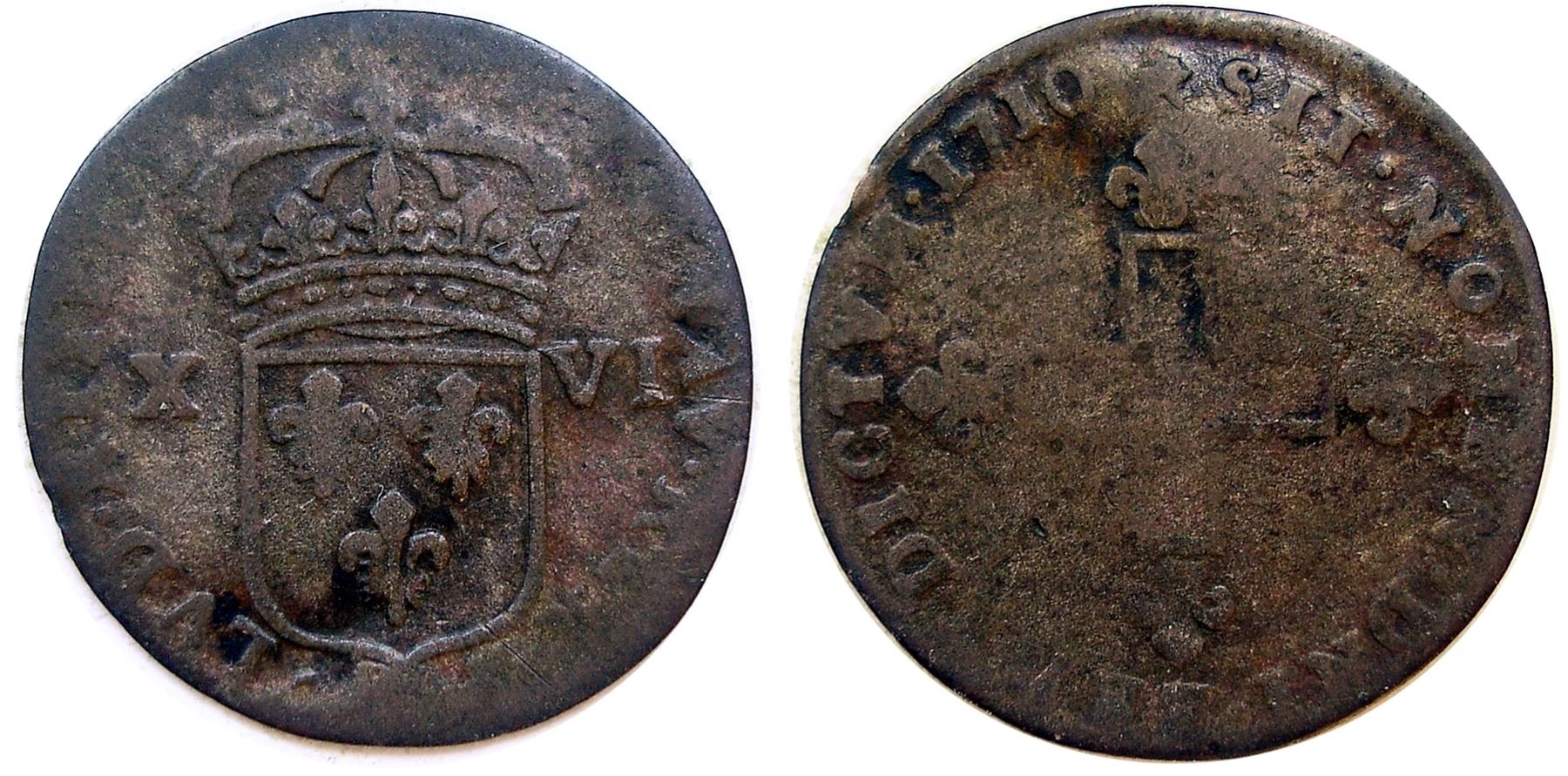 1710-BB Sol of 16 Deniers. Fine, likely closer to a full VF in terms of wear, but somewhat erratically struck, with about three-quarters of the obverse legend visible, and the reverse cross at the center weak, the rest reasonably sharp, and the date is bold. This is the lowest reported mintage issue for the entire series (though two years don’t have a reported mintage at all and two others are just estimated). Quite rare.