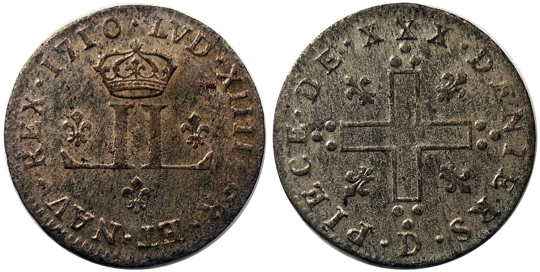 1710-D [Lyon Mint] Billon 30 Deniers. Vlack 2, Gadoury 102. Uncirculated, a rare mint state survivor of this workhorse coinage, quite rare in this condition. Boldly struck, all the legends, date and mintmark full, the design detail sharp on either side. Attractive golden toning atop the original silvering, with no real marks from usage as currency – a coin that was lovingly cared for over the course of three centuries! While not rare as a date, few examples have survived in high grade, though there were likely French collectors who added at least some colonial issues to their cabinets, a fortunate occurrence for collectors today!