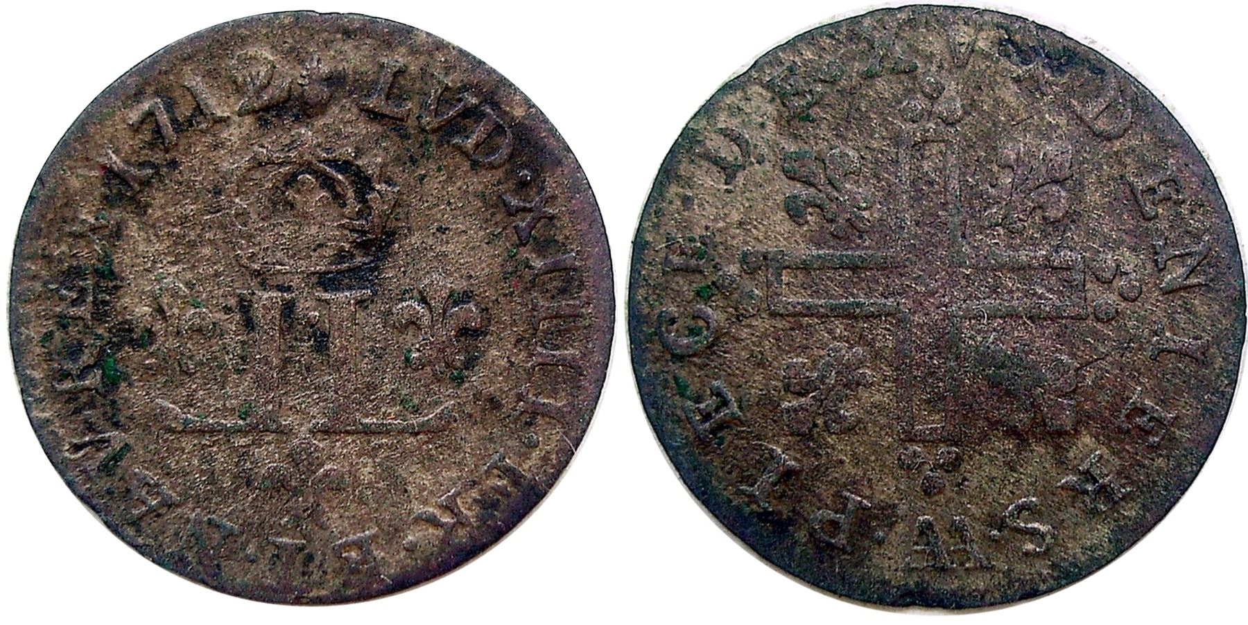1712/1-AA [Metz Mint] Billon 15 Deniers. Vlack 13a, Gadoury 95. Very Fine or nearly there, struck on a somewhat grainy planchet as often seen on the billon issues, but with the legends strong, the overdate easily visible and with design detail of the VF level. This overdate is quite rare, completely unlisted in Gadoury and rated an R-7 (on an 8-point scale) by Robert Vlack.