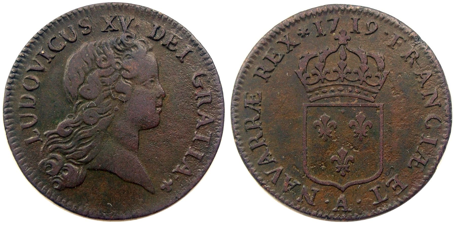 1719-A [Paris Mint] John Law Sol, Gadoury 276 [as are all of this denomination to follow].   Extremely Fine, a sharp example of this largest copper coin.  The legends, date and mintmark are all bold, and the design detail strong.  Olive brown, the surfaces lightly rough as typical for the type, but not bad at all.  While Paris was the main French mint, it did not strike much copper coinage in this era (though it did produce significant amounts of silver and gold).  In Smith’s census he examined 262 Sols, of which only 17 were of this date and mint, making it scarce, especially so sharp.