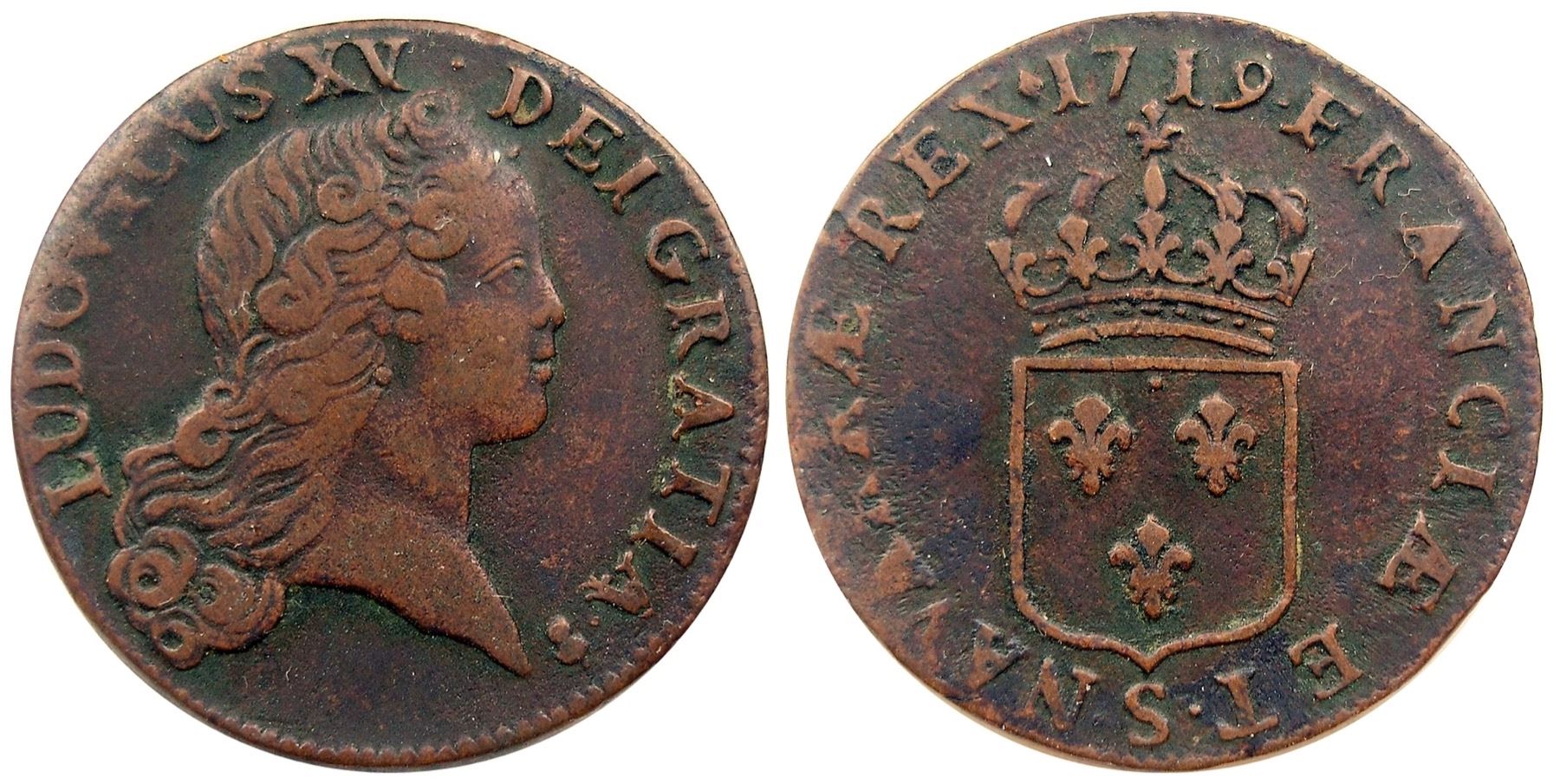 1719-S [Reims Mint] John Law Sol.  Choice Very Fine, the obverse legend originally punched into the die as LUDOVICUS XX – a non-existent King Louis the 20th!  The error was caught, and a V was punched over the last letter, and though the original X was lightly ground down, both of the lower legs can still be seen with the naked eye.  A major UNLISTED type, not mentioned in Gadoury or by Smith in his article, though he does note the same error with a 1720 date (offered below).  The was called XV/VX in the past, in the belief that the engraver transposed those two letters, but in describing the 1720-dated example with this same error, Smith called that improbable, and the present example seems to bear him out as the first letter is quite bold and its shape doesn’t allow for a V to be hiding under it (though there does appear to be some light work done in the die at the bottom of that letter).  Mahogany fields, some light patination in the legends, but few marks from actual circulation, which makes for an extremely attractive example of this major type.  Interestingly, Smith wondered if the engraver made the same mistake on more than one die – the present example confirms that hypothesis!  While the dies were clearly cut by the same hand the one used here with the 1719 reverse is different from that used with the 1720 reverse, most easily seen at the highest strand of hair in relation to the first letter of the legend – here about halfway up the L, while on the 1720 it is to the space between the L and U.  We also note that on this obverse die the final letter is notably double punched.  We have seen no other example of this error dated 1719, and it is certainly a most important specimen for the specialist.