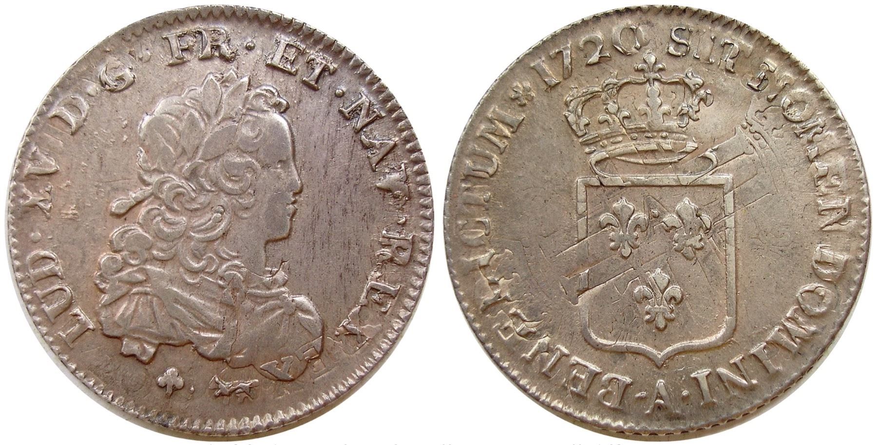 1720-A [Paris Mint] John Law Silver 1/3 Ecu, Gadoury 306.  About Uncirculated, struck over an earlier Petite d’Argent of 1720 – a coin that was literally struck just a few months earlier and likely never circulated!  Much of the distinct reverse design can be seen, including the mintmark at the center of the cross – which is also an A mint, which suggests that the original coin never actually left the mint before it was overstruck!  The original 1720 date can be faintly seen below the shoulder, which means the coin has two different designs bearing the same date and same mintmark, certainly an unusual occurrence!  Lovely light golden toning, with just light rub at the highest points of the obverse – given the lack of marks from circulation that could actually just be cabinet friction.  The obverse was struck from a late state of the die, with crumbling in the legend and field.  The Paris Mint struck more of the Petite d’Argents in 1720 than any other mint – some 11 million of them.  It struck nearly as many of the 1/3 Ecus in the same year, 1.5 million of which were struck over the earlier coinage, making the recoined version the rarer of the two.  This massive output of silver coins explains why they struck relatively few of the copper coins during the John Law years.  Collectors may not be aware that the recoined issues were literally marked as such – the dies used to strike them have a trefoil under the obverse bust, whereas the dies used to strike coins on new planchets did not.  While this date and mint is not rare, this is certainly a choice example, made even more desirable because of the prominent overstrike.