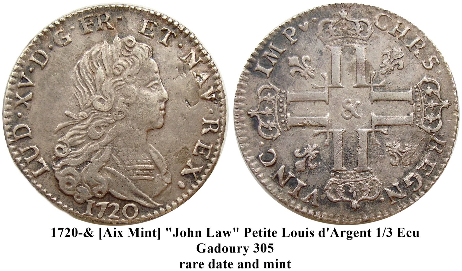 1720-“&” [Aix Mint] John Law Silver Petit Louis d’Argent (3 Livres), Gadoury 305.  Choice Extremely Fine, a lovely example from a very rare mint (Gadoury lists only the 1720-Z issue as rarer).  Boldly struck, the legends, date, mintmark and design detail all crisp.  There is a small scrape hidden at the lower right reverse in the fleur-de-lys there, and a small pre-strike flaw in the field in front of the King’s face on the obverse, otherwise the coin is perfect for the grade.  Lovely, lustrous light gray, the surfaces hard and the overall eye appeal choice in every way.  This particular issue is a fun one for collectors to pursue – this type was only struck in 1720, and struck at every French mint, giving 29 mintmarks to collect.