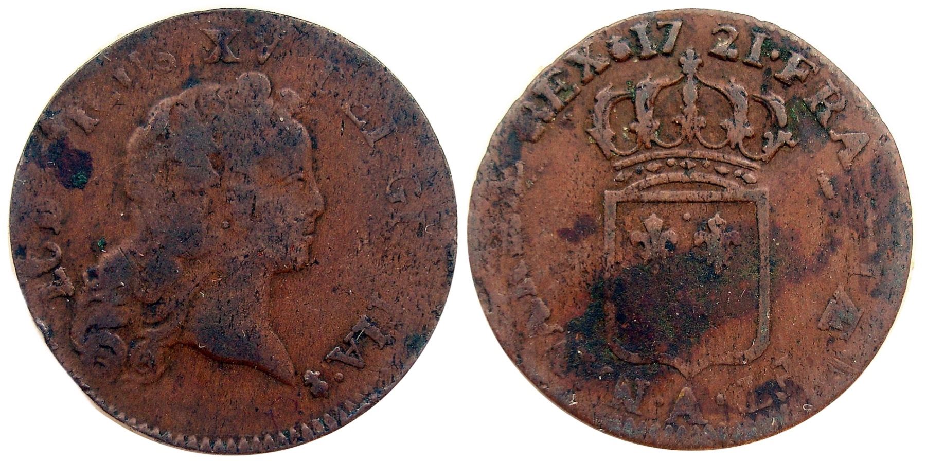 1721-A [Paris Mint] John Law Half Sol.  Nearly Very Fine, somewhat erratically struck, with some of the legend weak or lost at the extreme right of either side.  Medium brown with mottled darker hues.  This is a previously unlisted variety that clearly uses an upside-down A punch for the letter V at the top of the reverse, unusual since there  was certainly a V punch available – as can be seen on the above example – so the engraver likely just picked the wrong one up and made do with it.  The John Law series has only recently been studied in any sort of detail, and surely more interesting varieties like this will be found.