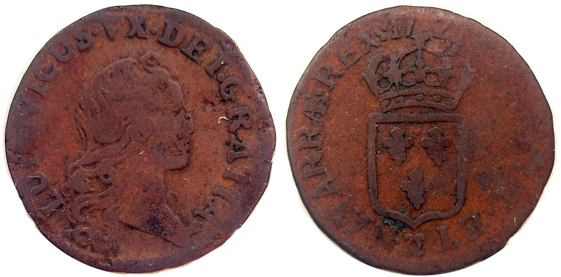 1721-CC [Besancon Mint] John Law Liard. Fine or slightly better, the obverse legend with the same LUDOVICUS VX error (instead of the proper XV) as seen on the 1720-dated specimen offered above. Indeed, it appears that not only is this the same error – it is actually the same obverse die, here used in two different years, amazing since one would expect the error to have been noticed and the die either corrected or pulled from service completely! Medium brown the obverse legend full, the all-important VX error bold. The reverse is weak at the right side, but the date and mintmark are both visible, the rest of the lettering mostly sharp. The VX error is listed in Gadoury for the 1720 date, but completely unlisted for 1721 – and is unnoted by Smith at all in his census of Liards. The only example we have record of, and a major rarity for the advanced specialist.