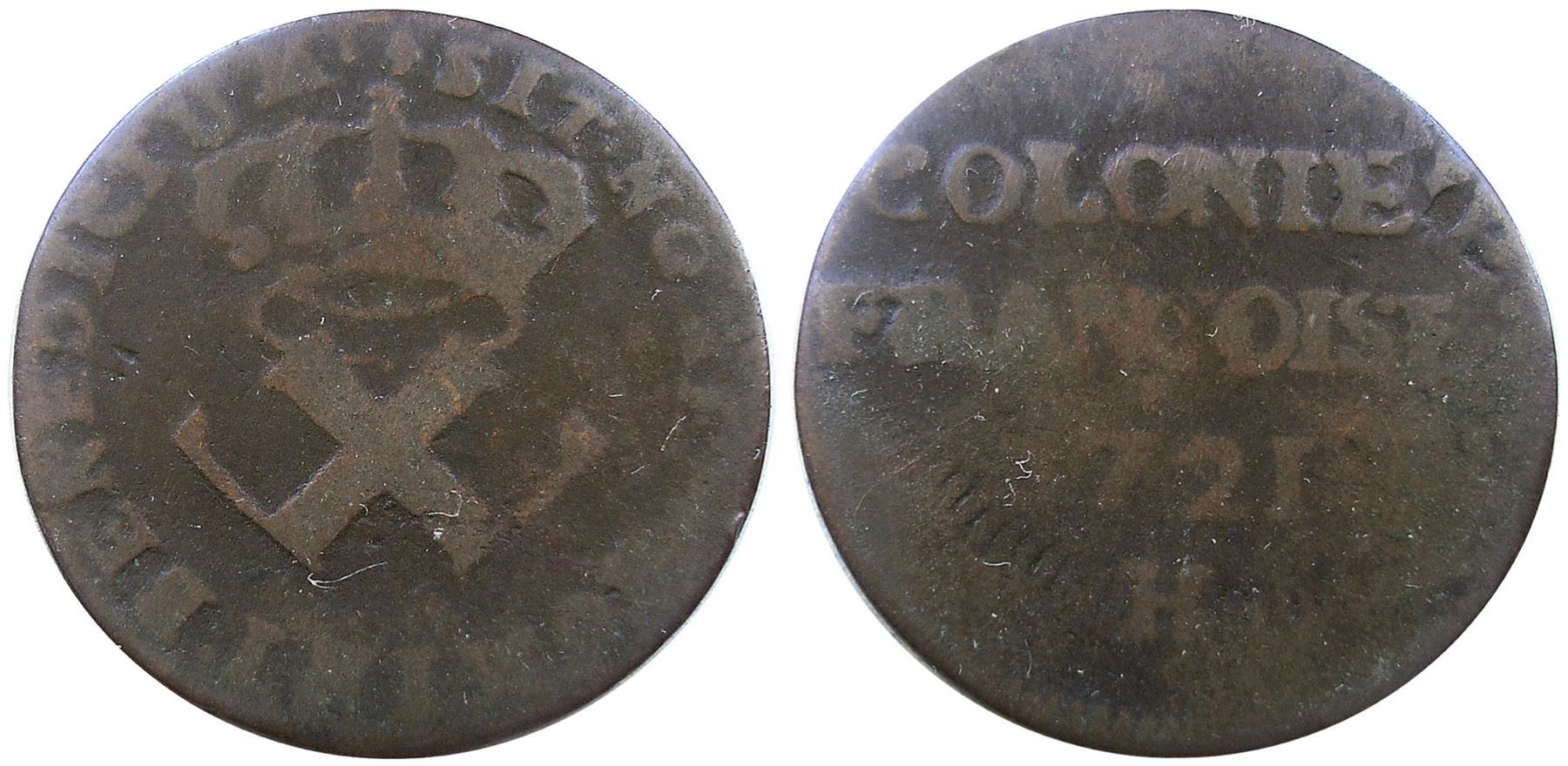 1721-H [La Rochelle Mint] Copper Nine Deniers, Martin 2.10-B.13.  Rarity-6.  Fine or slightly better, boldly DOUBLE STRUCK, easily seen as an extra row of denticles at the lower left reverse, and an errant IE from COLONIES at the upper right reverse rim, a very rare error in this series.  A few letters weak at the lower right obverse, likely due to the double strike, the remainder of the legend sharp for the grade, the date and mintmark both full.  Struck from the latest reverse die state illustrated by Martin, with extensive die chipping around the R of FRANCOISES.  A very rare variety, this obverse paired with two reverses, but the reverse used only in this combination – presumably breaking fairly early in its life and accounting for the rarity of the variety today.