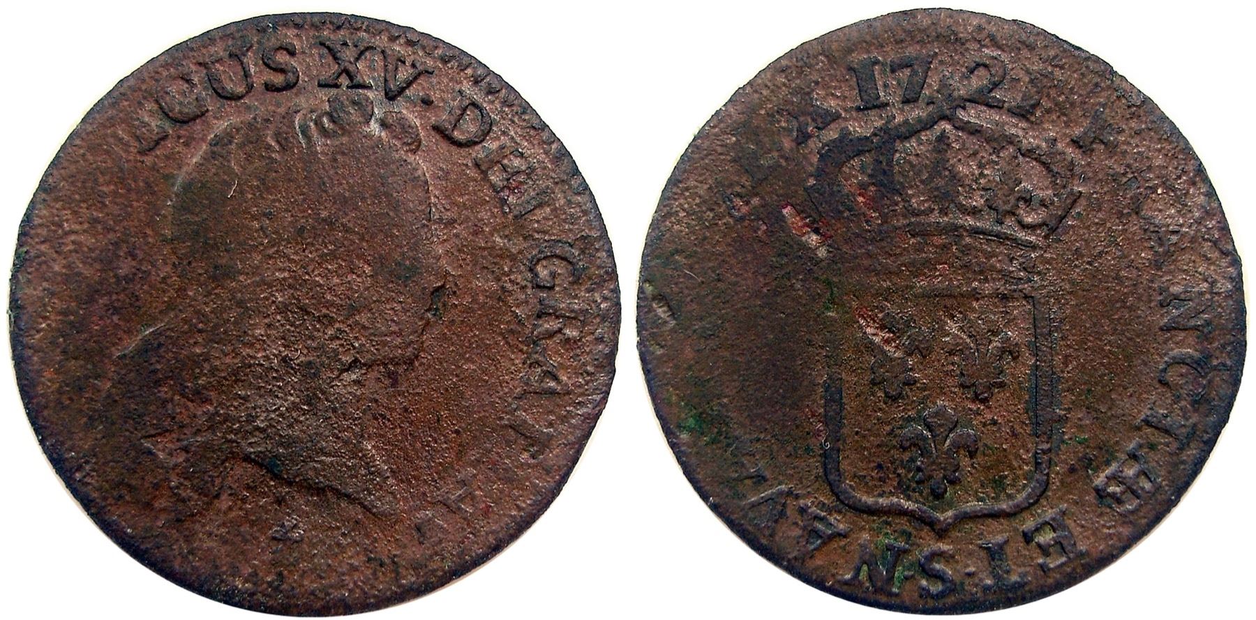 1721-S [Reims Mint] John Law Half Sol.  Fine, sharper than that in terms of wear, with the same striking weakness as the above coin with the legend at the left weak or missing.  A different type, lacking the dot after the date on the reverse.  Medium leather brown, the surfaces with a light roughness to them and a small lamination visible at the center reverse.