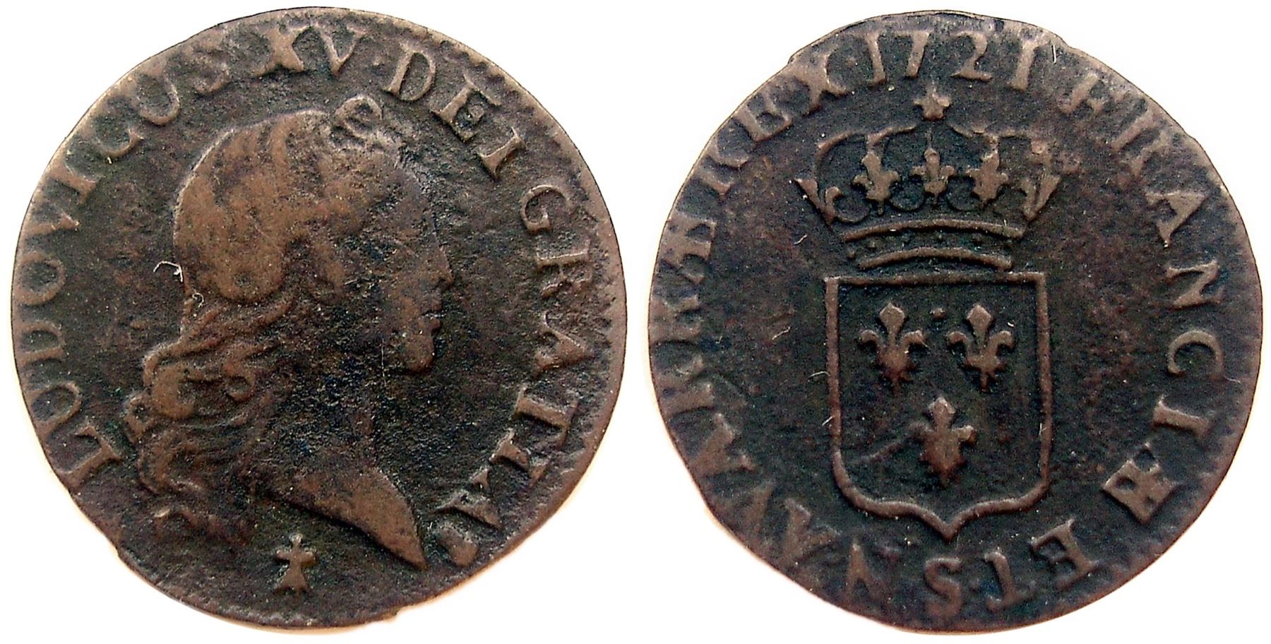 1721-S [Reims Mint] John Law Liard. Very Fine, well struck with the legends, date and mintmark all sharp, and nice design detail on either side. Attractive medium brown, the obverse slightly rough but overall nice. This is the most common of the Liards, with nearly half of Smith’s total Liard count being of this date and mintmark. Most examples seen have been in VF and lower grades, so the denomination was clearly used.