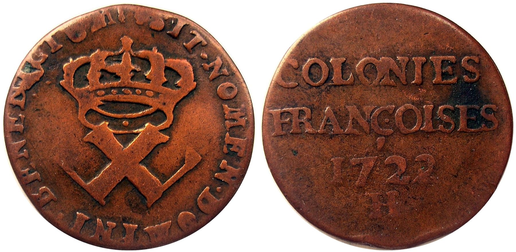 1722/1-H [La Rochelle Mint] Copper Nine Deniers, Martin 2.27-C.6.  Rarity-6.  Very Fine, very nearly in the choice category.  Boldly impressed obverse, the legend full and individual letters all sharp; the reverse just a shade weaker at the date and mintmark, though both are all there, the rest of the legend strong.  Glossy dark tan with a few areas of darker toning on either side.  Struck from the late state of this obverse die, with a prominent break through DIC, and some die chips in the field under that.  A very pleasing example of a rare variety, equal to the Martin plate coin.  This obverse paired only with this reverse, and was clearly used until it broke beyond repair; the reverse paired with one additional obverse.  A perfect example for the type.
