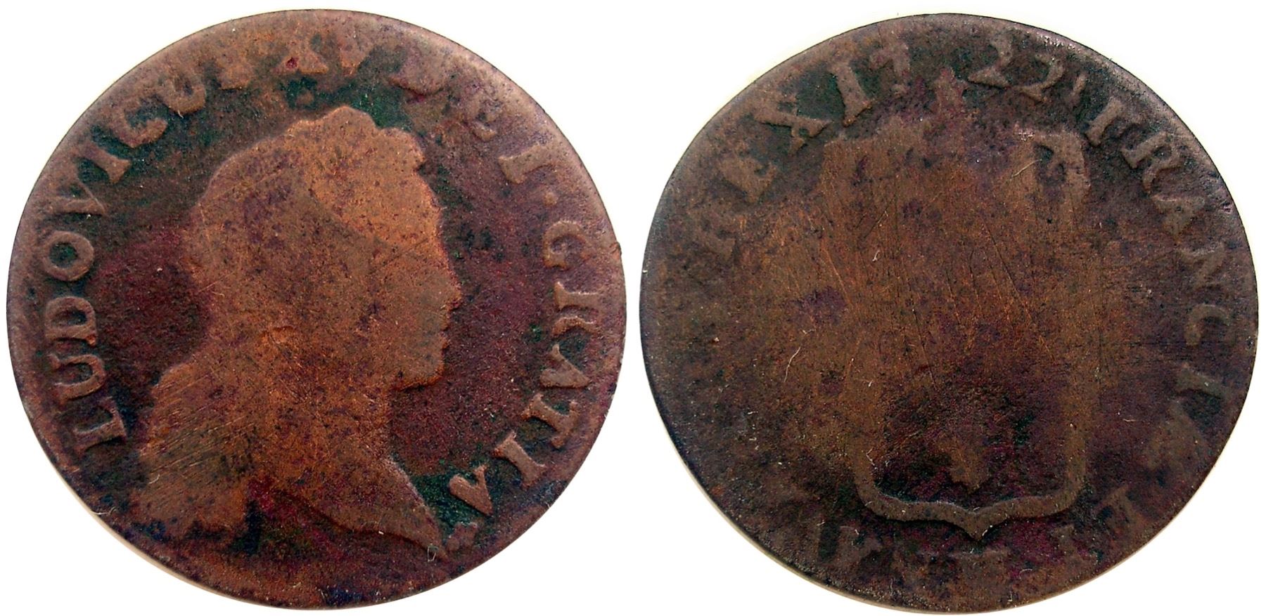 1722-H [La Rochelle Mint] John Law Half Sol. Very Good, a well-worn example from a rare mint, which struck this denomination for just this and the following year and the Sol in 1722 only – meaning it didn’t strike any at all during Law’s year in power. It is interesting that the first year La Rochelle struck this denomination was also the final year it coined the copper 9 Deniers issues (offered next in this sale), and it could be that the mint had surplus copper planchets on hand since it struck only a small fraction of the 9 Deniers issues that it was authorized to mint. Smith notes just 5 examples of this date and mint in the 255 Half Sols he studied, split between two different varieties, this the second one he illustrates, with the engraver’s mark above the tip of the bust. Quite rare.
