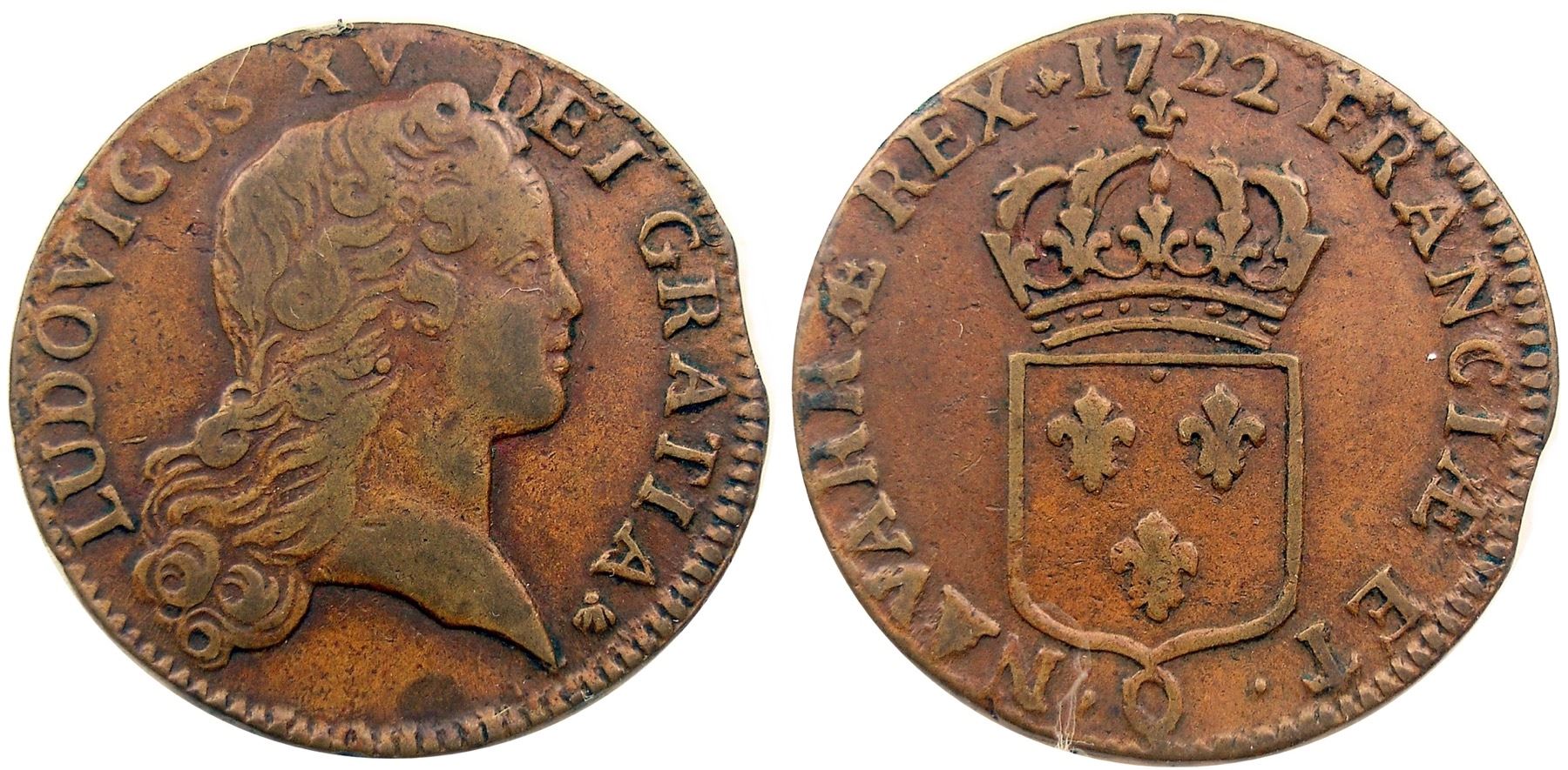 1722-Q [Perpignan Mint] John Law Sol. Choice Extremely Fine, a superb grade for ANY Perpignan issue, which are usually found indifferently struck on wretched planchet stock – the present coin is anything but! Well struck, full legends, date and mintmark, and with sharp design details on either side. The planchet is a gorgeous light golden brown, with a few specks of darker toning, the surfaces hard, with just the bare minimum of light circulation marks. A small planchet clip at the right obverse touches none of the legend on either side. Perpignan is the most unusual mint in the entire series, having started coinage in 1722, the same year as La Rochelle and Bordeaux, but while those two mints ceased coining the series the following year, Perpignan continued – striking the Half Sol in 1724 and sporadically striking the Sol denomination for another decade, finally ending the series in 1734 (not all dates from 1724-34 were coined). The Perpignan mint was the furthest from Paris, and quite close to the border with Spain – whether its officials never received an order to discontinue this coinage, or whether it was needed for local circulation and continued (with or without approval from Paris) is unknown. It is usually amongst the rarest mints for any of the series it coined, and has a special tie with the North American colonies since it was the only mint that produced the 1717 copper 6 and 12 Denier pieces authorized for Canada – when this coinage was aborted it is possible that the remaining unstruck planchets were used for the Half Sol and Sol denominations in the present series (Perpignan struck no Liards, and it is telling that there were no 1717 coins authorized that would have been on that size planchet, whereas the Sol and Half Sol do correspond to the 1717 coinage sizes). In any event, this is one of the most pleasing Perpignan issues we have seen. While only considered scarce – Smith noted 12 out of 262 Sols he examined – few of those are choice.