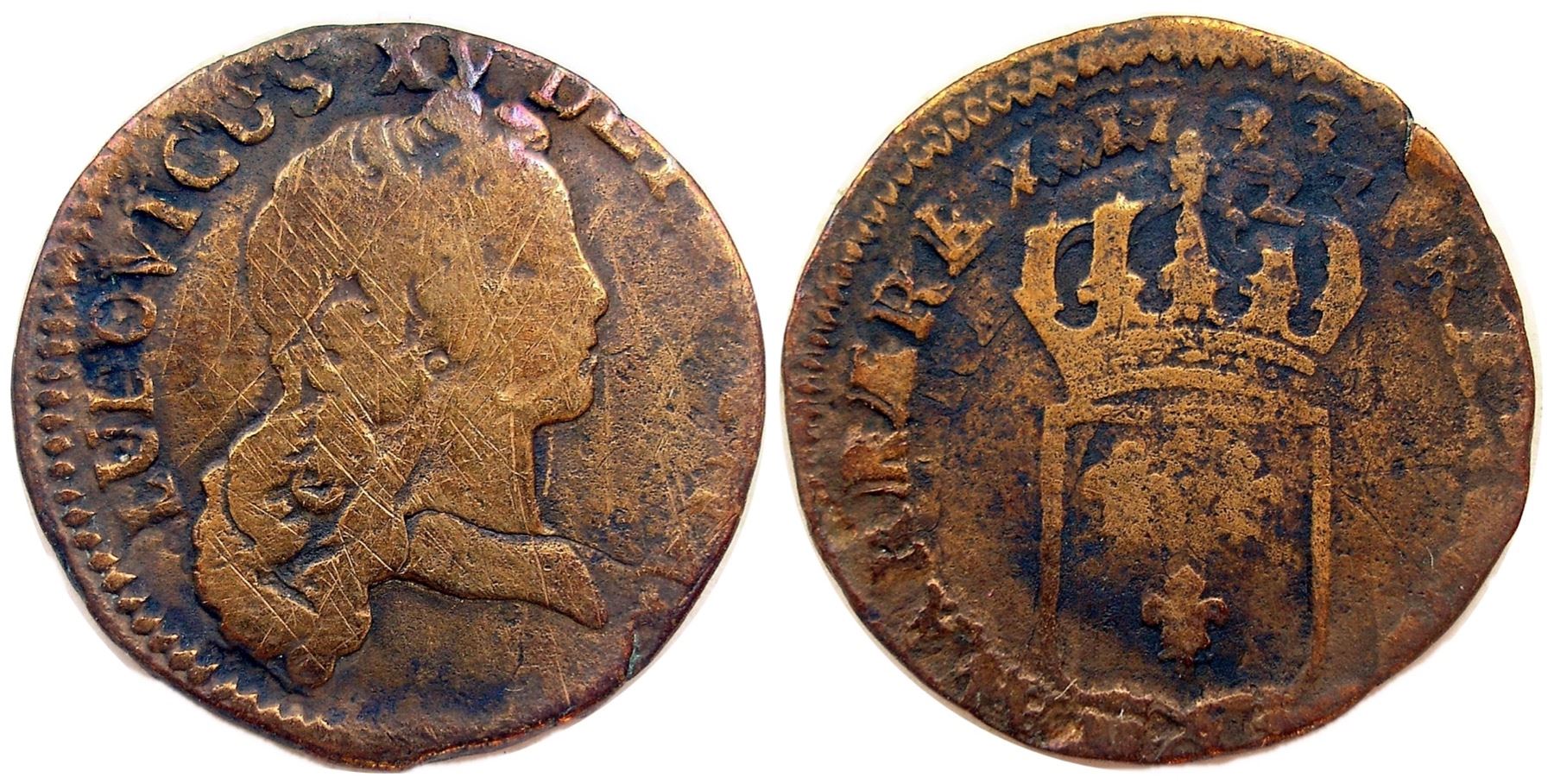 1723-Q [Perpignan Mint] John Law Half Sol. Very Fine for the issue, the Perpignan Mint pieces are almost always horribly struck and on low quality copper planchets. The Perpignan issues also have the greatest variety in terms of punctuation and placement of engraver and mint director’s marks. The present example is unusual in that it is at least TRIPLE struck, with perhaps four or more actual strikes; this most visible on the reverse where three dates can be seen. The legends are off the planchet at the lower right of either side, the remaining letters mostly strong. No punctuation visible in the legends that are on the planchet, and with the engraver’s mark at the end of the obverse legend. Struck in a distinctly brassy planchet which is typical for the Perpignan issues, some light scratches on the obverse, but the surfaces hard and overall with a dramatic look due to the multiple strikes. The Perpignan Mint was the only one to strike the exceedingly rare 1717-dated 6 and 12 Deniers coins, which were halted due to the abysmal quality of the copper planchets they used. Perpignan struck no copper coins for half a decade until it struck the 1722 Sols (offered later), and the Half Sous beginning a year later. It is likely that the poor quality copper found on most of the John Law issues from this mint, especially on the Half Sols, is from the same copper that struck the 1717-dated issues. Indeed, one of the 1717-Q 6 Deniers illustrated in the Appendix of Syd Martin’s book (its status uncertain) on the series shows the exact type of irregular planchet found on the Perpignan Half Sols so it could have been not just the same copper, but the exact same planchets used, another link between the John Law issues and North America!