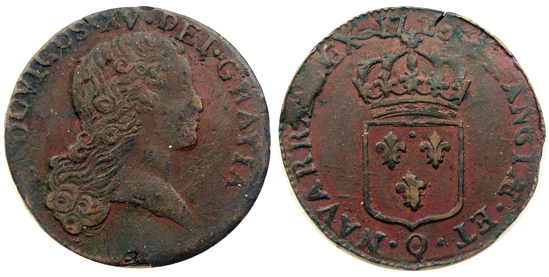 1726-Q [Perpignan Mint] John Law Sol, possibly a 1726/5 Overdate. Extremely Fine or so, an amazing grade level for a late-date Perpignan issue, especially so for a rare date, and the nicest example of the date we have ever seen. The first two letters are weak on the obverse, this due to a huge cud on the reverse directly opposite, which caused the metal to flow there into the letters; the cud also covers a few letters on the reverse. In Rock’s paper in The C4 Newsletter this exact specimen is illustrated and called a possible overdate, though unverified – along with the cud there are die breaks on the reverse, one through the base of the first three digits of the date, so what appears to be the tail of a 5 under the 6 may actually be another diebreak. In some respects it doesn’t much matter; even if it is a regular 1726 date the quality of the piece makes it just as desirable as it would be with an overdate! Surprisingly sharp design detail given the late state of the reverse, with most of the King’s hair sharp. Light russet brown, the surfaces mostly hard, a few hairline scratches on the obverse but choice to the eye. This variety has the hat mark to the left of the date, but curiously has no mint director’s mark on the obverse (usually these come with a scallop shell mark at the end of the obverse legend or below the bust). A superb example that will never need to be upgraded – and quite rare as well, Smith’s article noted just 3 examples of this date/mintmark/type out of the 262 Sols he examined, and the specimen he illustrates is markedly inferior – and a different die variety, so the overdate question still needs to be answered.