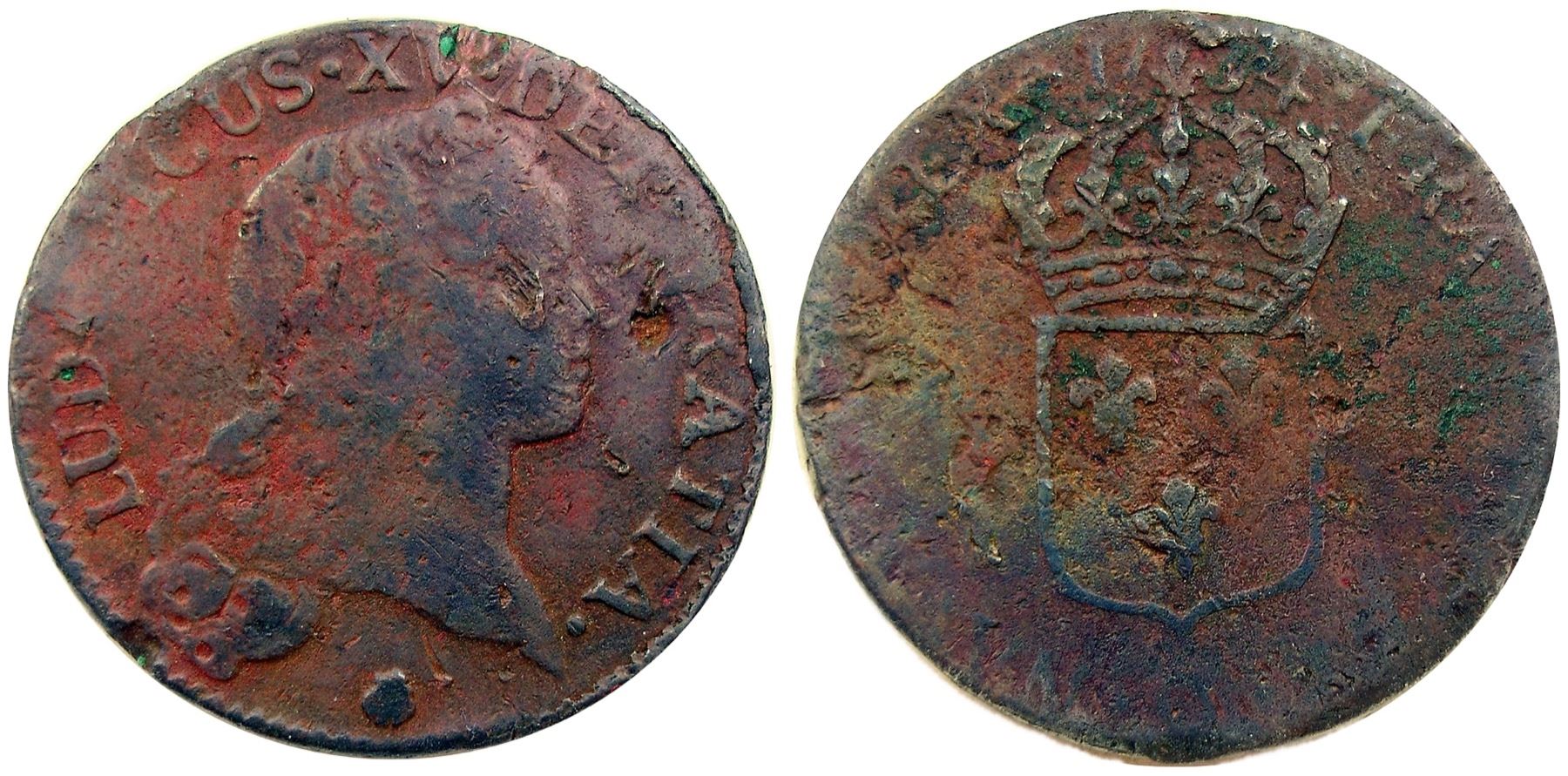 1734-Q [Perpignan Mint] John Law Sol.  Nearly Very Fine, the reverse weaker than the obverse, especially at the lower half, with the legends in that portion mostly gone, and a few stray letters weak on the obverse as well.  The date is sharp.  Russet brown, the surfaces with a light roughness, especially on the weaker part of the reverse, as well as a few planchet flaws and a couple scrapes on the obverse – the coin looks better in person than this strict description makes it sound!  The Perpignan mint didn’t strike the Sol in 1727, but did strike it in 1728 and 1729 (this date not listed in Gadoury, and a single example now known).  It is unknown why after a solid half decade of not coining the denomination Perpignan cut dies and issued more in 1734.  Brodus was still the engraver, and his hat mark is visible before the date – but the shell different on the obverse has migrated from the end of the legend to directly under the bust, and that may indicate that someone new was in the mint director job (often this passed from father to son and the shell may have been kept to indicate the same family but the location changed to indicate that it was not the same director as before).  Quite rare, Smith noted just 5 examples of the date in his survey of 262 Sols – and this final year of issue often comes in wretched condition.