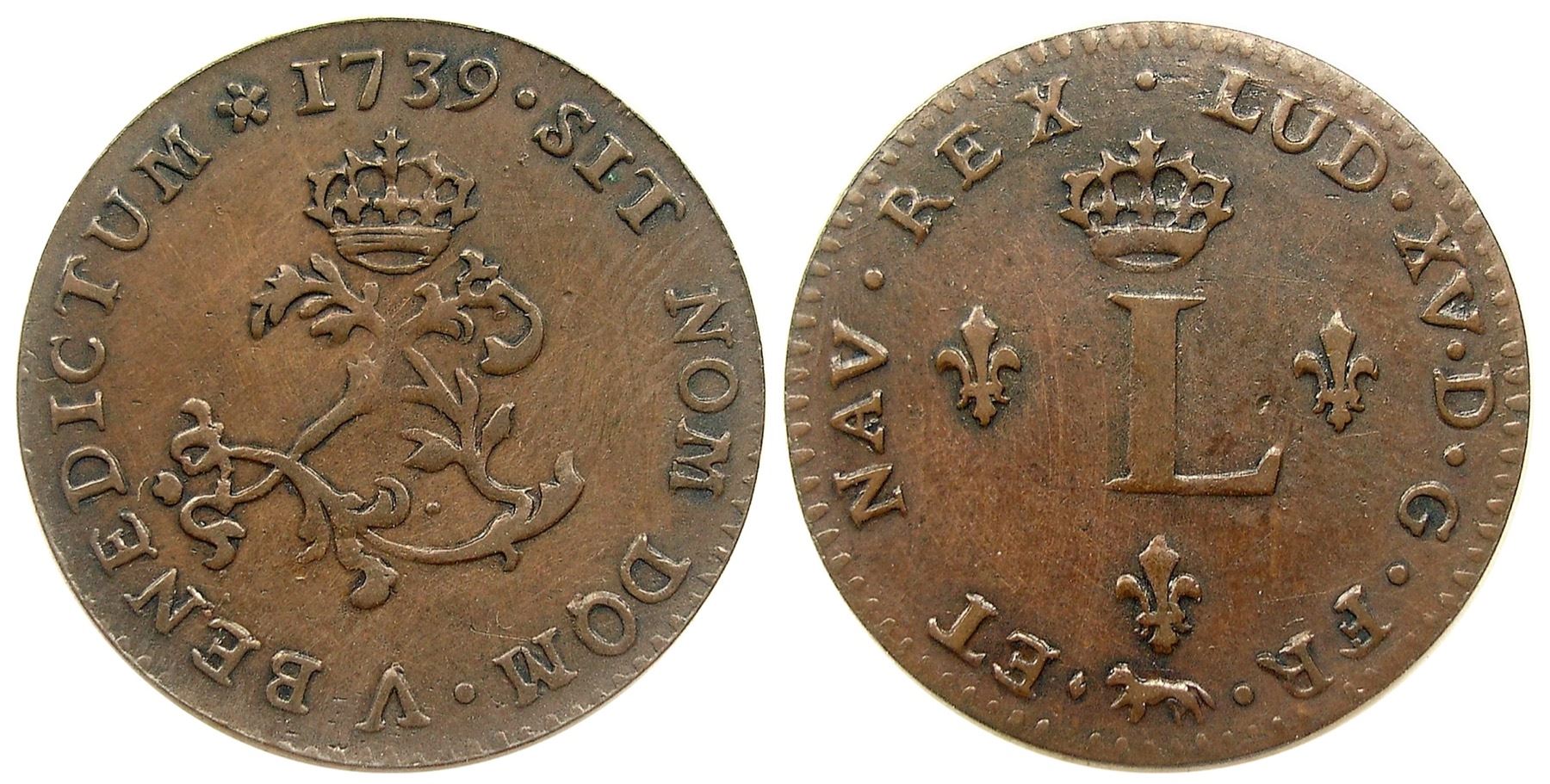 1739-A Billon Sous Marques. Vlack 18. Rarity-8, possible pattern issue? About Uncirculated, the VLACK PLATE COIN, the only example known when his book was written (one other has since been found). In his work Vlack notes “this variety must be given special attention. It has an inverted V for an A and no stop after NOM. It almost appears to be a pattern because of the sharpness in detail and perfect centering. This only known specimen is struck in copper, and while unusual, is believed to be a mint product.” In the January, 2008 Stack’s auction of the Vlack collection this exact specimen appeared as Lot 5085, complete with a box around the description to highlight its importance, and it brought $2,300, one of the highest prices in the run of 350+ Sous Marques that legendary collection contained. We note it was there graded Choice VF, likely because of some light reverse marks, but the coin is indeed an AU, and likely never circulated, with the light rub due to cabinet friction; it is easily plate matched to the Vlack book and auction by the presence of a tiny nick between the L and right fleur-de-lys on the reverse. Its status has continued to be debated. It is exceptionally well made, on a high quality copper planchet which never had any silvering – if this were a counterfeit issue, one would not expect it to be accepted in circulation when it was the wrong color and clearly copper instead of billon (the other known specimen is also on the same copper planchet). The die work is also well done, save for the mintmark, which is from the same V punch as that letter in NAV on the reverse; the engraver likely did not have an A punch on hand – the one used on NAV is the same upside-down V, with a crossbar added to make it into a proper A. It seems too well-made to be a counterfeit, and we agree with Vlack that it does appear a genuine Paris Mint product. But one wonders why a pattern would be made a year after the series started, instead of the first year – and why there was no mention of such a pattern in the literature on French numismatics in the last 250+ years. Certainly an enigma, and we agree with the Vlack auction cataloguer that “the cataloguer leaves the answer up to wiser heads than his.” Ford never owned an example, and we have found no other auction record for this extremely rare and important variety. We expect strong interest in this specimen – it is a museum-worthy coin!