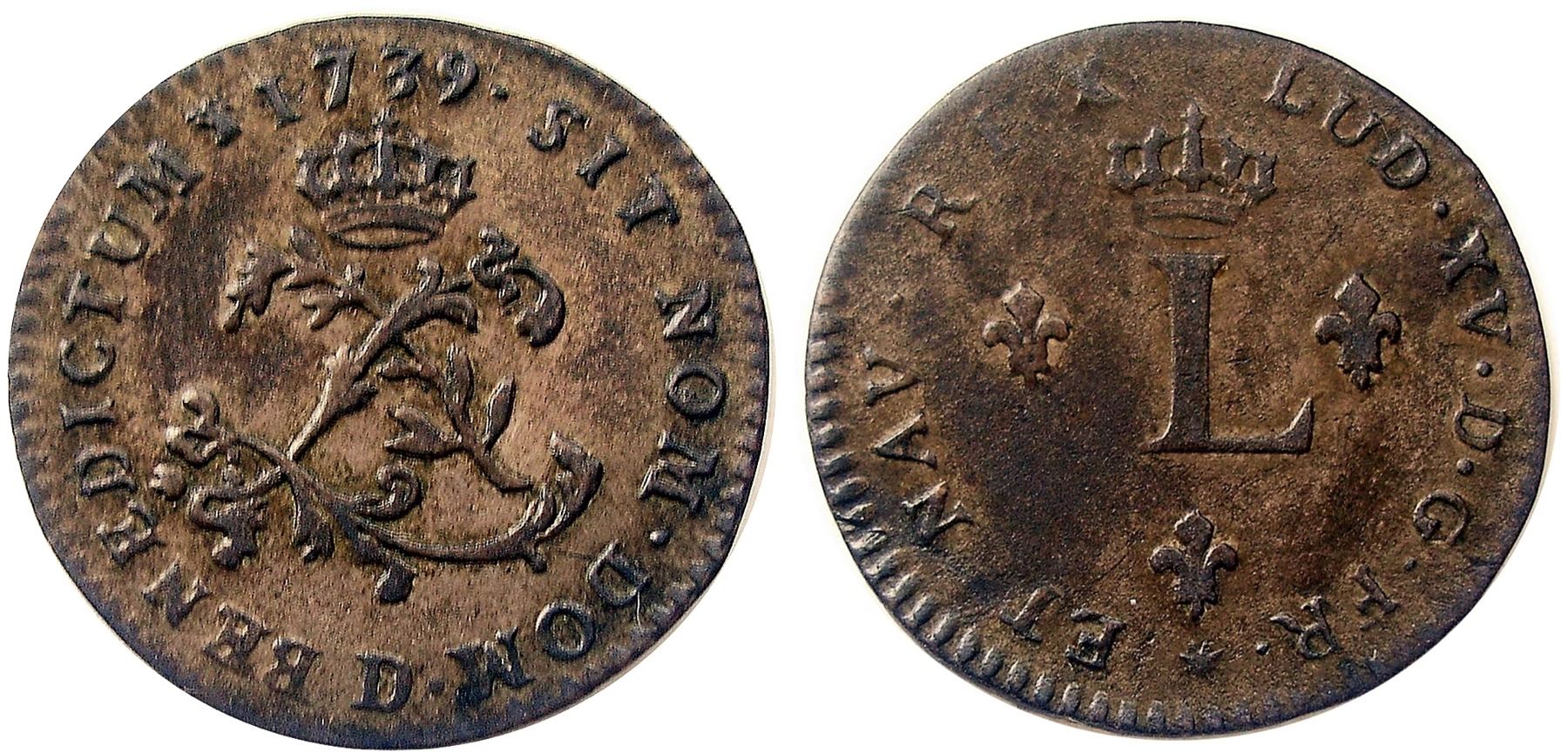 D – Lyon Mint - 1739-D Billon Sous Marques. Vlack 71. Rarity-1. Extremely Fine, just a bit softer than that at the upper left reverse, with EX of REX weak but visible; the rest of the legends on either side are bold, and the design detail is strong. Dark gold toned down from the original silvering, the surfaces with minor circulation marks, but the coin with very nice eye appeal overall. A common variety it is hard to find better than EF, and this one is a bit nicer overall than the Vlack or Ford coins. This example is from the collection of the late Mike Ringo and comes with his original envelope.