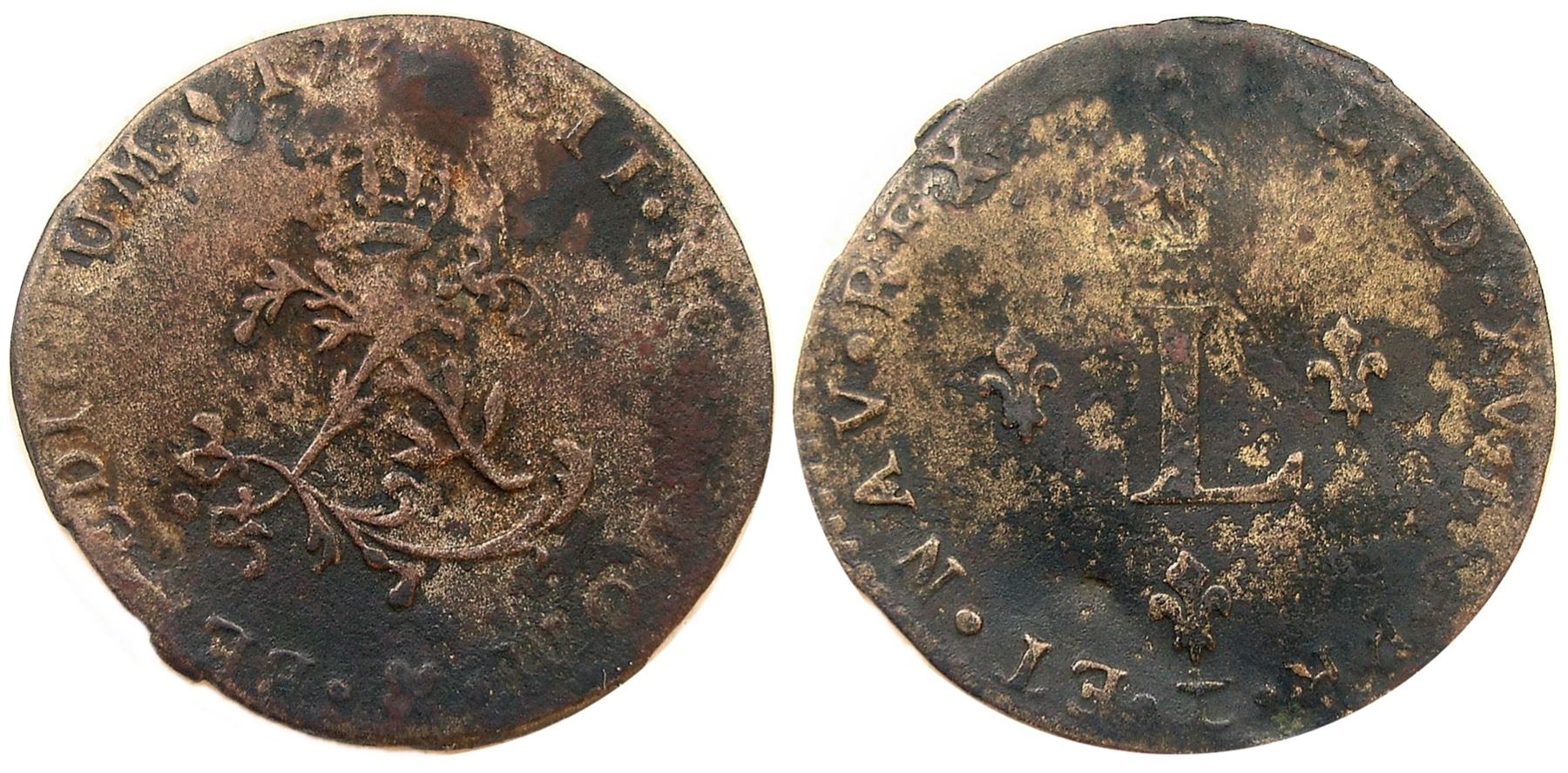 “&” – Aix Mint - 1739 – “&” Mint Billon Sous Marques. Vlack 232b. Rarity-8. Fine or slightly better in terms of strike and wear. The legend is mostly full, just the M of NOM weak on the obverse and DG on the reverse; all the unusual punctuation called for by Vlack is visible (stop after SIT, mintmark and ET), making it easy to identify this extremely rare variety. Dark pewter surfaces with some mottled russet tone where the silvering has worn off, though nearly half that original silvering remains on either side. A few light marks and roughness, but the condition almost unimportant, as the variety is exceedingly rare – none of the mint at all in Ford, and while the Vlack collection contained both the 232 and the more common 232a, he never found an example of 232b.