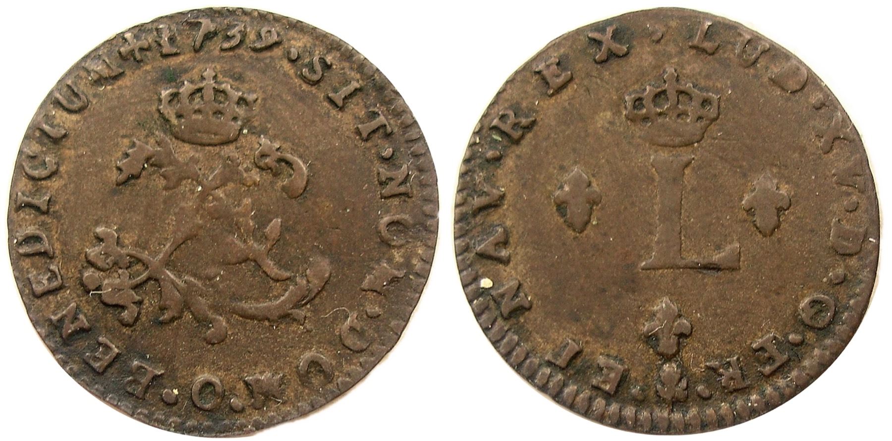 O – Riom Mint - 1739-O Billon Sous Marques.  Vlack 145e.  Rarity-5.  This is one of the two John Ford collection specimens, and we thought it the nicer of the two.  It appeared as Lot 206 of the Stack’s January, 2006 sale of his collection where it was described as “Very Fine.  Medium gray on both sides.  Struck on a flan which is somewhat out of round.  Minor surface granularity.”  Ford purchased the coin in 1973, making it one of the earliest provenances for a French Colonies coin in his collection.  Sharp for the grade, the legends and date all bold.  This coin is accompanied by the original lot ticket from the Ford sale.