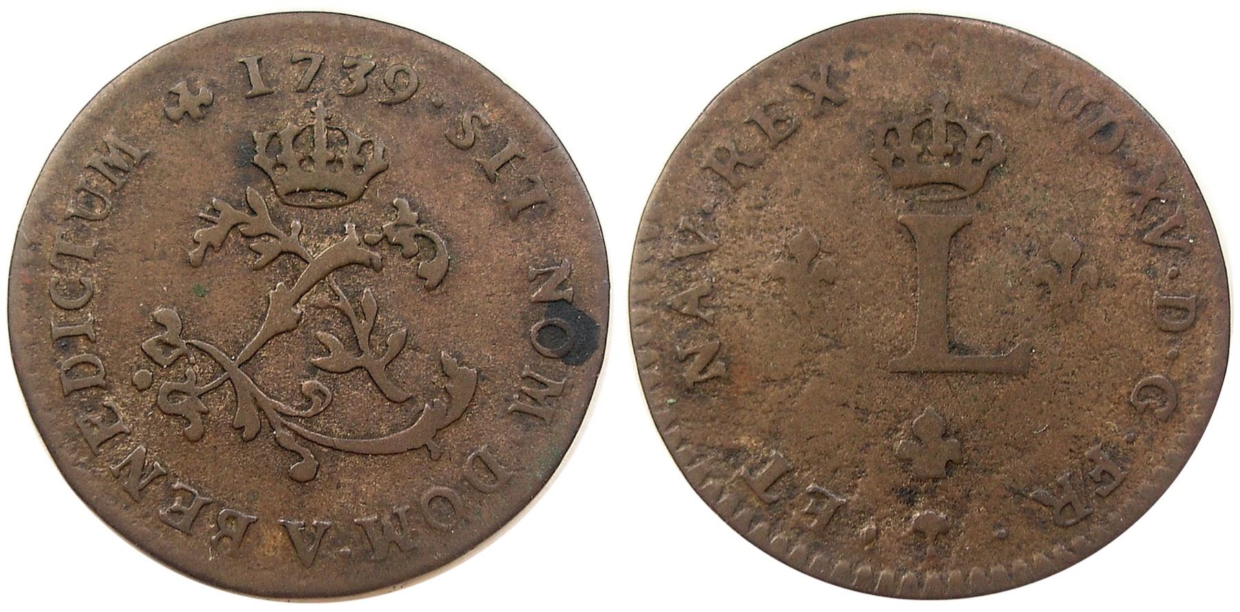 V – Troyes Mint - 1739-V Billon Sous Marques.  Vlack 193.  Rarity-2.  Very Fine, the legends full and strong on either side, the central obverse design sharp, the reverse all there but just a little weaker.  Rich golden, almost tan color, the obverse with a few darker toning spots, and with traces of silvering on the legend and design; the reverse a trifle rough but not bad.