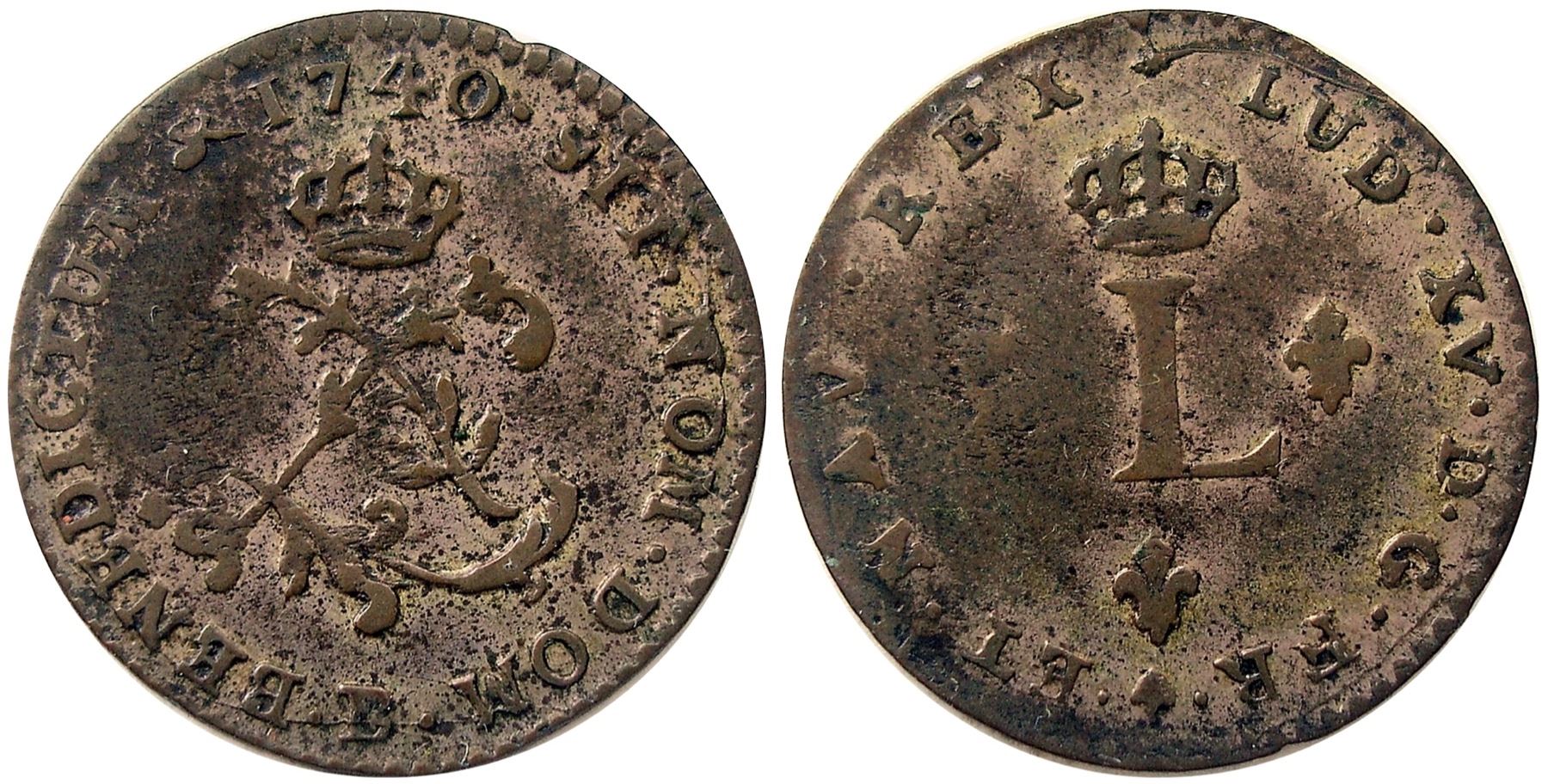 B – Rouen Mint - 1740/39-B Billon Sous Marques. Vlack 51a. Rarity-7. Nearly Extremely Fine, a sharply struck example, the legends full and the individual letters all strong; the date is also sharp and clearly shows the top of the original 3 and tail of the original 9 poking out from the numbers punched over them. Struck from late states of both dies, with several breaks through the peripheral legends on either side. About three-quarters of the original silvering still on either side, toned down to a darker hue, and with a large number of microscopic striations on either side that give the look of darker flecks, but they were there as struck. No real marks or damage from circulation, and a pleasing example of this very rare variety. None in Ford, the Vlack coin similar to this in strike, with a more even color.